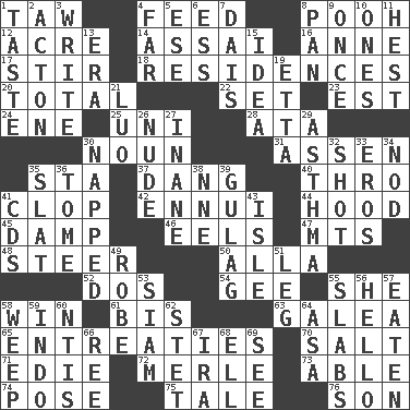 ACROSS 1. The 23rd letter of the Hebrew alphabet 4. Nourish 8. "Silly old bear" 12. 1/640 square mile 14. Slender Brazilian palm 16. Singer Murray 17. Tumult 18. Dwellings 20. "_____ Recall" 22. Put into a specified state 23. Eastern Standard Time (abbr.) 24. Compass dir. 25. University (slang) 28. "One Day ___ Time" 30. Part of speech 31. NE Netherlands city 35. R.R. building 37. Mild oath, euphamism for damn 40. Through, poetically 41. Hoof sound 42. World-weariness 44. Parka part 45. Moist 46. Snakelike fish 47. Mountains (abbr.) 48. Navigate 50. Silent film actress Nazimova 52. Two (Sp.) 54. Unit of force equal to gravity 55. A female animal or person 58. Acquire through effort 61. Altar cloth linen 63. An organ shaped like a helmet 65. Pleas 70. Table seasoning 71. Singer Brickell 72. Haggard of country music 73. Competent 74. Airs 75. Story 76. Male offspring DOWN 1. Clothes sense 2. NE Massachussets city 3. Compose 4. Distant 5. Compass dir. 6. Curvy letter 7. Raised platform 8. Baking dish 9. Single time 10. Singles 11. Behest 13. Period 15. The content of cognition 19. Singer James 21. Nilotic language 26. Naked 27. Empty; void 29. Respiratory problem 30. Slept 32. Guess 33. Greek god of love 34. Allow head to fall sleepily 35. Narrow board 36. Heavy book 38. Compass dir. 39. Russian prison camp 41. Music discs 43. Small island 49. Loose flowing garment 51. Part of a journey 53. Thailand, formerly 55. Thick slices 56. Phone greeting 57. Eroded 58. Shed a tear 59. Southeast Asian peninsula 60. Nuclear Threat Initiatives 62. Proofreading order 64. White ___ sheet 66. To separate or throw off 67. Retirement account (abbr.) 68. Pipe bend 69. Perceive with the eye