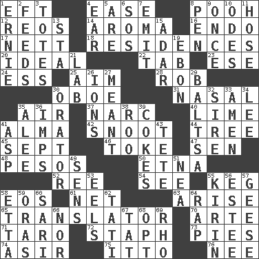ACROSS 1. Lizard (obsolete) 4. Comfort 8. "Silly old bear" 12. Vintage cars 14. Odor 16. Inside; within (prefix) 17. Remaining after all deductions 18. Dwellings 20. Standard of perfection 22. Keyboard key 23. Compass dir. 24. Double-curved letter 25. Direct toward a target or goal 28. Director Reiner 30. Mitch Miller's instrument 31. Relating to the nose 35. Atmosphere 37. Drug cop 40. Welles in "The Third Man" 41. _ mater 42. Snout, nose 44. Woody plant 45. Back-to-school mo. 46. Casino tip 47. Elected rep. 48. Mexican monetary units 50. Inactive volcano in Sicily 52. To riddle 54. Observe 55. Cask 58. Greek goddess of the dawn 61. Fish or hair follower 63. Ascend 65. Interpreter 70. Johnson of "Laugh-In" 71. Pacific island yam 72. Staphylococcus 73. Sliced desserts 74. SW Saudi Arabia district 75. "Tell ____ the Marines!" 76. Born DOWN 1. Bert's buddy 2. Gives food to 3. Lugs 4. Ewer handle 5. "We ___ not amused" (Victoria) 6. Mayday 7. Give off 8. Animal enclosure 9. At one time in the past 10. Lyric poems 11. Flexible conduit 13. R.R. building 15. The sixth month of the Jewish calendar 19. Inky black, to poets 21. Experiment locale 26. Charged particles 27. Intended 29. Greek mezzo-soprano Agnes 30. Speaker 32. Beget 33. So be it 34. Area sheltered from the wind 35. Toward shelter 36. Naughty children 38. Friend of Pooh 39. Popular sodas 41. Cleo's killer 43. False hair 49. Elected reps. 51. Teachers' org. 53. Snakelike fish 55. Japanese brewing company 56. First name in cosmetics 57. Honkers 58. Singer James 59. Mouths or openings 60. Indian skirt 62. Jacques of French films 64. Hit sharply and swiftly 66. Or not 67. Make lace 68. Elect 69. 17th letter of the Greek alphabet
