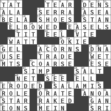 ACROSS 1. Make lace 4. Pull into pieces 8. Hiding places for outlaws 12. Chicken ___ king 13. Spanish missionary in California 14. At sea 15. Actor Lugosi 17. Imelda's hoard 18. Comedian Laurel of Laurel & Hardy 19. Shoved, as through a crowd 21. Artist's stands 23. Teat (slang) 24. Snakelike fish 26. Compete 27. Electrical Unit 28. Migrant worker of the '30s 30. Set 31. Oak nuts 34. Heredity factor (abbr.) 37. Purpose 38. Barter 39. Dripping 40. Mountains (abbr.) 41. Rough 42. Compass dir. 43. Simple or foolish person 44. Table seasoning 46. Fish or hair follower 47. Perceive with the eye 50. Pipe bend 51. Eaten away 54. Deli grouping 57. Hero or heavy, e.g. 58. Speak pompously 60. Small Philippine buffalo 62. Play the lead 63. Moved through 64. Separate the seeds from cotton 65. Immeasurably long periods of time 66. Count _ (2 wds.) 67. _ Lanka DOWN 1. Bar bill 2. Toward shelter 3. Baron Munchausen's specialties 4. Giggle 5. Eat (away) 6. "We ___ not amused" (Victoria) 7. To erase 8. Small ungulate mammals of Africa 9. First name in cosmetics 10. Actress Patricia 11. Without 13. Compass dir. 16. "This won't hurt ____!" 20. Baseball player Mel 22. Advice 25. Titled peers of a realm 27. Compass direction 29. Leg joint 30. Chewing product 31. Smallest unit of an element 32. Dice game 33. Boat paddle 34. Residences 35. A home for chicks 36. Had dinner 41. Quote 43. Spring feasts 44. Ocean 45. _ mater 46. Pitcher Ryan 48. 1973 Nobel Price Winner (Physics) Leo 49. Ingested 51. Celtic language 52. Printing process, for short 53. Dormintory (informal) 55. Directed 56. Fly high 59. Actress Charlotte 61. Black tropical American cuckoo