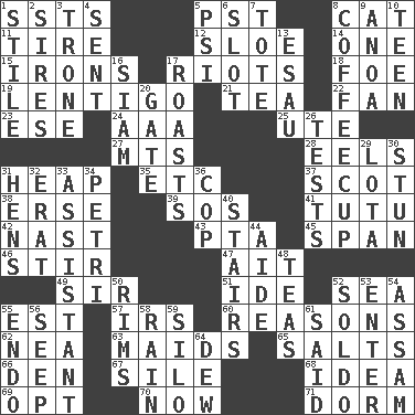 ACROSS 1. Fast planes 5. Pacific Standard Time (abbr.) 8. Feline 11. Hoop that covers a wheel 12. A type of plum 14. Single 15. Metal shackles 17. Debaucheries 18. Enemy 19. Small, flat, pigmented spot on the skin 21. Afternoon social gathering 22. Avid follower 23. Compass dir. 24. American Automobile Association (abbr.) 25. Shoshoni 27. Mountains (abbr.) 28. Snakelike fish 31. Pile 35. And so on (abbr.) 37. Highlander 38. Celtic language 39. Mayday 41. Ballerina skirt 42. Political cartoonist Thomas 43. Parent Teacher Association (abbr.) 45. Connect, as a bridge 46. Agitate 47. Small island 49. Title for a knight 51. Binary compound 52. Ocean 55. Eastern Standard Time (abbr.) 57. Big collection agency 60. Thinks logically 62. Teachers' org. 63. Unmarried girls 65. Table seasonings 66. Lair 67. Filth; sediment 68. The content of cognition 69. Elect 70. Immediately 71. Dormintory (informal) DOWN 1. Vertical member of a panel or frame 2. Founders of families 3. Marketplace scale 4. Transmitted 5. Air pressure measure (abbr.) 6. Position in a hierarchy or organization 7. Carryall 8. Java holder (2 wds.) 9. Small Philippine buffalo 10. Adolescent 13. Son of Isaac 16. Thailand, formerly 17. Ridicules or criticizes harshly 20. Yard entry 26. Trials 29. Globular water bottle used in Asia 30. Make senseless or dizzy 31. Coop moms 32. Part of Q.E.F. 33. Helper 34. _ dish (used to culture cells) 36. Police officer (slang) 40. Flight of steps 44. Helper 48. Beverages made from leaves 50. Basketball hoops 52. Twentieth part of a lira 53. Keyboard key 54. Indian state 55. Inside; within (prefix) 56. Ooze 58. Precipitation 59. Grain storage tower 61. Expressed in words 64. Morning condensation
