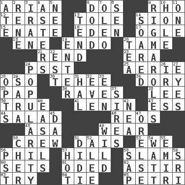 ACROSS 1. Believer in; advocate of (suffix) 6. Two (Sp.) 9. 17th letter of the Greek alphabet 12. Laconic 13. Lacquered or enameled metalware 14. The Jewish people; Israel 15. Related on the mother's side 16. Paradise 17. Stare at amorously 18. Compass dir. 19. Inside; within (prefix) 20. Docile 21. Tear apart 23. Epoch 24. Inconspicuous attention getter 25. Nest on high 28. Bear (Spanish) 30. Giggle 34. Small, narrow, flatbottom fishing boat 35. Infant food 36. All-night dance parties 38. Area sheltered from the wind 39. Loyal 41. Soviet premier 1918-24 43. Curvy letter 44. First course 46. Vintage cars 48. White ___ sheet 49. Erode 50. Group working together 51. Raised platform 53. She-sheep 56. Silvers or Donahue 57. Land elevation 58. Criticizes harshly 60. Puts into a specified state 61. Wrote a lyric poem 62. Having gotten out of bed 63. Attempt to accomplish something 64. Make a knot 65. _ dish (used to culture cells) DOWN 1. Had dinner 2. French philosopher Descartes 3. SW Asia republic 4. Michaelmas daisies 5. Born 6. Texas town _ City 7. Butter sub 8. Elected rep. 9. Frustrating wastes of time 10. Opening into or through something 11. Single 13. Look after 14. Flew 19. Keyboard key 20. Afternoon social gathering 22. Eastern Standard Time (abbr.) 24. Teen's desire 26. Angers 27. Snake ____ (dice throw) 28. Chooses 29. "Two Mules for Sister ____" 31. Actor Linden 32. Night before a holiday 33. Car or cant ending 37. Begets 40. Artist's stands 42. Teachers' org. 45. Obsolete 47. Threatening words 49. Rampant 50. "Mermaids" star 51. "You Light Up My Life" star Conn 52. Toward shelter 54. Electrical Unit 55. Independent ruler or chieftain 56. Pacific Standard Time (abbr.) 57. Being at a high temperature 58. Plant excrement 59. Indian title of respect (Mr.)