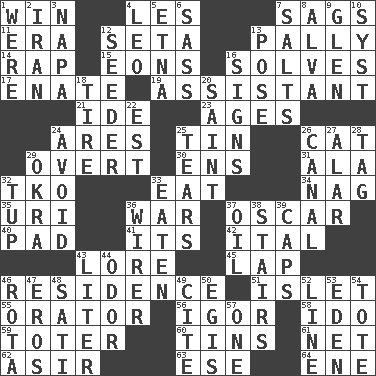 ACROSS 1. Victory 4. French article 7. Droops 11. Period 12. Stalk of a moss capsule 13. Chummy 14. Hit sharply and swiftly 15. Immeasurably long periods of time 16. Finds the solution 17. Maternal 19. Helper 21. Binary compound 23. Ripens 24. Ancient Greek god of war 25. Shallow baking pan 26. Feline 29. Unconcealed 30. Followers of ems 31. Wing 32. Ring climax 33. Erode 34. Tired old horse 35. RI univ. 36. Armed conflict 37. Witty Wilde 40. Groovy apt. 41. It is 42. Slanted text style (abbr.) 43. Old wives' tales, e.g. 45. Pet locale 46. Dwelling 51. Small island 55. Speaker 56. Russian composer Stravinsky 58. Wedding promise 59. Carrier 60. Airtight sealed metal containers 61. Fish or hair follower 62. SW Saudi Arabia district 63. Compass dir. 64. Compass dir. DOWN 1. We are 2. SW Asia republic 3. California wine valley 4. Lion 5. Inactive volcano in Sicily 6. Backtalk 7. Table seasonings 8. Inventor's middle name 9. Small, secluded valley 10. System (abbr.) 12. Sowing specialist 13. Introduce or present, as a question 16. Public displays of written messages 18. Hoop that covers a wheel 20. Inhabitant of Heaven 22. Eastern Standard Time (abbr.) 24. Prevent the occurrence of 25. Lacerates 26. Lessep's creation 27. Having or resembling wings 28. Label 29. Gumbo ingredient 32. Uncastrated adult male sheep 33. Consumed 36. One who wires 37. Lubricate 38. Flight of steps 39. Smile enhancers 43. 61 cubic inches 44. Aroma 46. Round or rotation of duties 47. Greek god of love 48. Suttee (variant) 49. Quote 50. The front part of a cuirass 52. Actor's bit 53. Locale of original sin 54. Carryall 57. Single