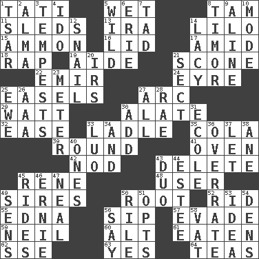 ACROSS 1. Jacques of French films 5. Soggy 8. Scottish cap 11. Bobsleighs 13. Retirement account (abbr.) 14. _ and Stitch 15. ID or VA city 16. Hat (slang) 17. Among 18. Reproach for some lapse or misdeed 19. Helper 21. Biscuitlike quick bread 22. Independent ruler or chieftain 24. Jane of fiction 25. Artist's stands 27. Curve 29. Electrical Unit 30. Having winglike extensions 32. Comfort 33. Dipping utensil 35. Root beer relative 39. One shot 41. Baking chamber 42. Lower and raise head in agreement 43. Erase 45. French philosopher Descartes 48. One who makes use of a thing 49. Begets 50. Carrot, for example 52. To free from 55. Pulitzer Prize-winning author Ferber 56. Small drink 57. Dodge 59. Famous astronaut Armstrong 60. The first octave above the treble staff 61. Eroded 62. Compass dir. 63. Consenting reply 64. Afternoon social gatherings DOWN 1. Russian ruler of old 2. _ mater 3. Storms 4. Wedding promise 5. Rampant 6. 4th largest of the Great Lakes 7. Small amount or degree 8. Southeast Indonesia island 9. Place in a line 10. Method 12. Slow-paced one 14. Made of lace 20. Big collection agency 21. Religious group 23. Distance measurement 25. She-sheep 26. Auto club (abbr.) 27. Everything 28. Actress Charlotte 30. Increase 31. Learning spot: Fr. 33. Nilotic language 34. Also 36. Make much ado about nothing 37. Allow 38. One (Scot) 40. Washington bills 43. Superhero pair 44. First name in cosmetics 45. Amusement-park features 46. Bert's buddy 47. Be tempered by heat 49. Elected reps. 50. Cause heat under the collar 51. Elects 53. The main thing one is thinking about 54. Habitations of wild animals 56. Declare 58. Large container