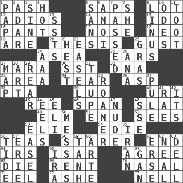 ACROSS 1. Romantic infatuation 5. Plant excrements 9. Car dealer's back yard 12. Goodbye (Sp.) 14. Wet nurse 15. Wedding promise 16. Leg coverings 17. Characteristic smell of wine 18. Modern: prefix 19. "We ___ not amused" (Victoria) 20. College paper 23. Abrupt rush of wind 24. Toward the sea 25. Hearing organs 27. Hindu Mythology: god of death 30. Fast jet (abbr.) 32. Heredity factor (abbr.) 33. Type of rug 34. Pull into pieces 36. Viper 38. Parent Teacher Association (abbr.) 39. Nilotic language 40. RI univ. 43. To separate or throw off 46. Connect, as a bridge 48. Narrow board 49. Shade tree 51. Australian flightless bird 52. Perceives with the eye 53. Writer Wiesel 54. Singer Brickell 56. Afternoon social gatherings 58. A viewer who gazes fixedly 61. Conclusion 64. Big collection agency 65. Austrian river, tributary to the Danube 66. Match 68. Expire 69. Monthly bill 70. Relating to the nose 71. Snakelike fish 72. American tennis player Robert 73. 1994 drama film starring Jodie Foster DOWN 1. Dad 2. The sixth month of the Jewish calendar 3. Trig term 4. Being at a high temperature 5. Without 6. Mine, in Marseilles 7. Went by 8. A female animal or person 9. "_ and Lucy" (Charlie Brown theme song) 10. Lyric poems 11. A blast of a horn 13. Fast planes 21. Behest 22. Artist's stands 23. Pate de foie ____ 24. Auto club (abbr.) 26. Santa ___, CA 27. Atlas unit 28. Nonscientific branch of learning 29. Bring up, as a child 31. Grayish beige 35. Wanderer 37. Whimper 41. Actress Charlotte 42. It is 44. Snakelike fish 45. Connecticut Ivy Leaguer 47. Unadorned 48. Compass dir. 50. Makes clutter 53. Artist's stand 55. SW Asia republic 56. Event that recurs at intervals 57. One of the Great Lakes 59. Hyperbolic tangent 60. Johnson of "Laugh-In" 61. Celtic language 62. Anneal 63. Small valley 65. Lyricist Gershwin 67. Separate the seeds from cotton