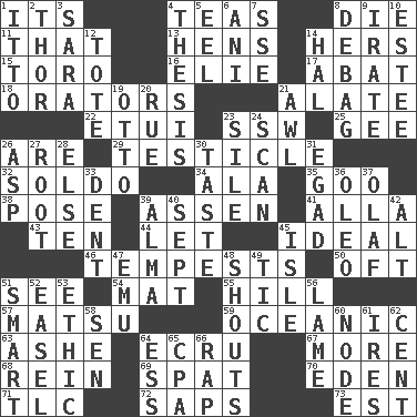 ACROSS 1. ___ a Wonderful Life 4. Beverages made from leaves 8. Pass on 11. Not this but _ 13. Coop moms 14. Possessive pronoun 15. "Corrida" creature 16. Writer Wiesel 17. Blind as ____ 18. Speakers 21. Having winglike extensions 22. Needle holder 23. Compass dir. 25. Unit of force equal to gravity 26. "We ___ not amused" (Victoria) 29. One of the two male reproductive glands 32. Twentieth part of a lira 34. Chicken ___ king 35. Thick or sticky substance 38. Introduce or present, as a question 39. NE Netherlands city 41. Silent film actress Nazimova 43. "___ Little Indians" 44. Allow 45. Perfect 46. Storms 50. Often (poetically) 51. Perceive with the eye 54. Floor covering 55. Land elevation 57. Taiwanese island in East China Sea 59. Pertaining to the sea 63. American tennis player Robert 64. Shade of tan 67. Greater amount 68. It's straight from the horse's mouth 69. Argument over a trivial matter 70. Paradise 71. Affectionate concern, for short 72. Plant excrements 73. Eastern Standard Time (abbr.) DOWN 1. "Tell ____ the Marines!" 2. Son of Odin 3. "Two Mules for Sister ____" 4. College paper 5. Snakelike fish 6. Black tropical American cuckoo 7. Compass dir. 8. Debunk (Brit. slang) 9. Feeling or showing extreme anger 10. First name in cosmetics 12. Carryall 14. Actor Linden 19. Von Bismarck 20. Regret 21. Leather borer 23. Drop; flow; fall 24. Glance over 26. Cleo's killer 27. Carrot, for example 28. Otherwise 30. Clothes sense 31. Mild oath 33. Incision 36. Butter sub 37. Norwegian king 39. _ mater 40. Back-to-school mo. 42. The first octave above the treble staff 45. Capri or Wright 47. Australian flightless bird 48. Yells 49. Nervous spasm 51. Don Adams' spy role 52. Artist's stand 53. Value system 56. Unable to walk 58. Elected rep. 60. Connecting point 61. Angers 62. Penny 64. Curvy letter 65. Accounting whiz (abbr.) 66. Strike