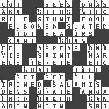 ACROSS 1. Small bed 4. Perceives with the eye 8. Mouths or openings 12. Alias (abbr.) 13. Grain storage towers 14. Grain storage tower 15. Cause heat under the collar 17. Difficult or unusual or dangerous feat 18. Calm and collected 19. Shoved, as through a crowd 21. Scheduled 23. Small child 24. Ocean 26. Big collection agency 27. Patter 28. Pate de foie ____ 30. Snakelike fish 31. Seem 34. Heredity factor (abbr.) 37. Compete 38. Virtuous person 39. Armed conflict 40. Raised railways 41. Cigar-shaped 42. And so on (abbr.) 43. Water vessel 44. Falsehood 46. Arrange properly for use 47. Observe 50. Pipe bend 51. Pressed 54. Deli grouping 57. Hiding places for outlaws 58. Declaim 60. Small Philippine buffalo 62. Inside; within (prefix) 63. Swept the length of 64. Separate the seeds from cotton 65. Arabian gulf 66. Chow _ 67. _ Lanka DOWN 1. 4-wheeled motor vehicle 2. Migrant worker of the '30s 3. Baron Munchausen's specialties 4. Settings 5. Dodge 6. A really long time 7. Fast planes 8. Motion picture awards 9. Disturbances 10. Medicinal plant 11. Disposed of to a purchaser 13. Compass dir. 16. Inky black, to poets 20. Baseball player Mel 22. One who doesn't tell the truth 25. Rep 27. To provide with a ceiling 29. Pace 30. First lady 31. At sea 32. Pieces 33. Sliced dessert 34. Homes 35. Nathan's nickname 36. Curve 41. Haul 43. Gillaume's butler role 44. Beverage made from leaves 45. _ mater 46. Message 48. 1973 Nobel Price Winner (Physics) Leo 49. Consumed 51. It may be bright or harebrained 52. Tear apart 53. Dormintory (informal) 55. Directed 56. Fly high 59. Actress Charlotte 61. Black tropical American cuckoo