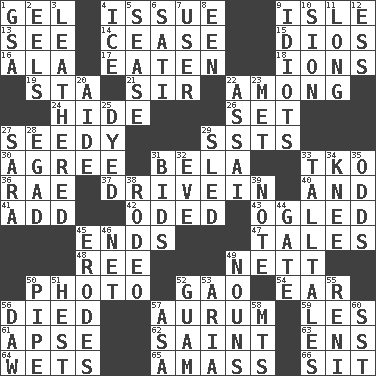 ACROSS 1. Set 4. Come out of 9. Capri or Wright 13. Perceive with the eye 14. Desist 15. "Vaya con ____" 16. In the manner of 17. Eroded 18. Charged atoms 19. R.R. building 21. Title for a knight 22. Amid 24. Flintstone garb 26. Arrange properly for use 27. Full of seeds 29. Fast planes 30. Match 31. Actor Lugosi 33. Ring climax 36. Actress Charlotte 37. Popular '50s hangout 40. Added to 41. Say or write further 42. Wrote a lyric poem 43. Stared 45. Extremities 47. Lies 48. Portuguese money of account (variant) 49. Remaining after all deductions 50. Picture 52. E Mali city 54. Hearing organ 56. Passed on 57. Gold (Symbol: Au) 59. French article 61. Domed church section 62. Inhabitant of Heaven 63. Followers of ems 64. Soaks 65. Collect or gather 66. Be seated DOWN 1. Girls' org. (abbr.) 2. Snakelike fish 3. Resembling or made to resemble leather 4. Frozen water 5. Gospel singer Marvin 6. Suttee (variant) 7. One who uses or employs something 8. Car or cant ending 9. Foolish or stupid persons 10. The Jewish people; Israel 11. Protracted 12. Curvy letter 20. Assistant 22. Slender Brazilian palm 23. Was introduced to 25. Colored 27. "Two Mules for Sister ____" 28. Mild oath 29. Downhill vehicle 31. Auction offers 32. Night before a holiday 33. Baron Munchausen's specialties 34. Leg joint 35. Probability 38. Cowboy competition 39. Musical sound 44. Yard entry 45. Eats (away) 46. Fish or hair follower 49. Parts of speech 50. Corncob 51. Command 52. Island territory of the United States 53. Operatic vocal solo 55. Painter Guido (1575-1642) 56. Obsolete 57. White ___ sheet 58. Mountains (abbr.) 60. Fast jet (abbr.)