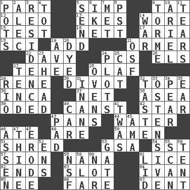 ACROSS 1. Role in a play 5. Simple or foolish person 9. Make lace 12. Margarine 13. Supplements with great effort 14. Had on 15. Trial 16. Remaining after all deductions 17. Roberta Peters solo 18. _-fi 19. Say or write further 21. Channel Islands abalone 22. _ Jones' Locker 24. Personal Computers (abbr.) 26. Raised railways 27. Giggle 28. Norwegian king 29. French philosopher Descartes 30. A piece of turf (Scot.) 32. Drink excessively 36. South American Indian 37. Fish or hair follower 38. At sea 39. Wrote a lyric poem 40. 2nd pers. sing. pres. of can (arch.) 42. Play the lead 43. Baking dishes 44. Wetness 46. Had dinner 49. "We ___ not amused" (Victoria) 50. So be it 51. Tear up 53. Girls' org. (abbr.) 54. Fast jet (abbr.) 57. The Jewish people; Israel 58. Nanny 61. Louse (plural) 62. Conclusions 63. Slit 64. _ the terrible 65. Born 66. Conductor's collection 67. Gouge DOWN 1. Cooking vessels 2. Actor Baldwin 3. Home 4. Small child 5. Transmit 6. Eisenhower's nickname 7. Was introduced to 8. Pacific Standard Time (abbr.) 9. Singer Mel 10. Satellite of Uranus 11. Pulls into pieces 14. Armed conflict 19. "___ Maria" 20. Colored 21. Order of Saint Francis (abbr.) 23. Forward in time 24. Secret plans 25. Feline 27. Be inclined (to) 28. Baking chambers 29. _ de Janeiro 31. Silly 32. Clothes sense 33. Clearly or manifestly demonstrative 34. Lightbulb-shaped fruit 35. Ewer handle 40. 4-wheeled motor vehicle 41. It was, poetically 43. Writing tablet 45. Wet nurse (var.) 46. NE Netherlands city 47. One or ones belonging to thee 48. Eat (away) 52. Followers of ems 53. Yard entry 55. Glance over 56. Portable shelter 58. Overdraft (abbr.) 59. Insect wing 60. Not either 61. Flaplike covering