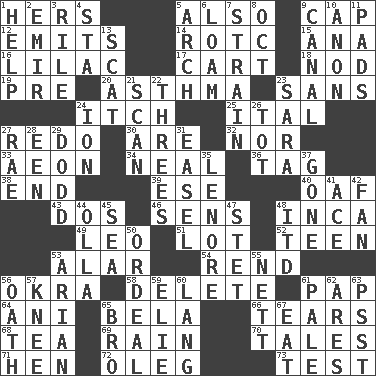 ACROSS 1. Possessive pronoun 5. In addition 9. Head covering 12. Sends forth 14. College mil. group 15. Santa ___, CA 16. Pale purple color 17. Haul 18. Lower and raise head in agreement 19. Before (prefix) 20. Respiratory problem 23. Without 24. Hankering 25. Slanted text style (abbr.) 27. Redecorate 30. "We ___ not amused" (Victoria) 32. Not either 33. A really long time 34. Actress Patricia 36. Label 38. Conclusion 39. Compass dir. 40. Clumsy lout 43. Two (Sp.) 46. Elected reps. 48. South American Indian 49. Lion 51. Car dealer's back yard 52. Adolescent 53. Having or resembling wings 54. Tear apart 56. Gumbo ingredient 58. Keyboard key 61. Infant food 64. Black tropical American cuckoo 65. Actor Lugosi 66. Lacerates 68. Beverage made from leaves 69. Water falling in drops from the sky 70. Lies 71. Layer 72. Cassini of fashion 73. Trial DOWN 1. Aid 2. Independent ruler or chieftain 3. Cause heat under the collar 4. R.R. building 5. Bowlike part 6. Rich soil 7. Put through a sieve 8. Sep. follower 9. Lessep's creation 10. At once, immediately (arch.) 11. Writing tablets 13. Scram! 21. Glance over 22. Triplets 23. "Two Mules for Sister ____" 24. Electrically charged atom 26. Small child 27. Actress Charlotte 28. Car or cant ending 29. Texas town _ City 31. Artist's stand 35. Poe poem 37. Went 41. Adept person 42. Avid follower 44. Rounded earthenware pot or jar 45. Ocean 47. Proofreading order 48. It would 50. Severe or trying experience 53. Believer in; advocate of (suffix) 55. Remaining after all deductions 56. Pledge 57. Leg joint 59. Writer Wiesel 60. Austrian-born American filmmaker Fritz 61. Diluted with white 62. Ancient Greek god of war 63. Inconspicuous attention getter 65. Sis' sibling 67. Erode