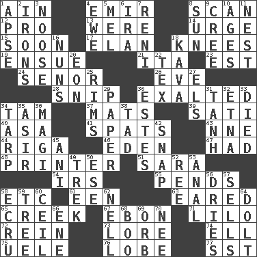 ACROSS 1. The 18th letter of the Arabic alphabet 4. Arab leader 8. Examine minutely or intensely 12. Adept person 13. We are 14. Goad 15. Within a short period 17. Style 18. Leg joints 19. Take place subsequently 21. Call ___ day 23. Eastern Standard Time (abbr.) 24. Sir (Sp.) 26. First lady 28. Sever or remove by pinching or nipping 30. Honored 34. Scottish cap 37. Floor coverings 39. Suttee (variant) 40. White ___ sheet 41. Arguments over trivial matters 43. Compass dir. 44. Capital of Latvia 46. Locale of original sin 47. Possessed 48. Hard copy producer 51. "Two Mules for Sister ____" 54. Big collection agency 55. Depends 58. And so on (abbr.) 61. Car or cant ending 63. Having ears or earlike features 65. Small stream 67. Inky black, to poets 71. _ and Stitch 72. It's straight from the horse's mouth 73. Old wives' tales, e.g. 74. Pipe bend 75. Ubangi River tributary 76. Ear part 77. Fast jet (abbr.) DOWN 1. Domed church section 2. Metal shackles 3. Trap for birds or small mammals 4. She-sheep 5. Cartoonist voice _ Blanc 6. Lyricist Gershwin 7. Painter Guido (1575-1642) 8. Player for Phoenix 9. Algonquian 10. Ripens 11. Egg locale 16. Religious women 18. Polynesian shrub of the pepper family 20. A really long time 22. John Ritter's dad 25. Basketball hoops 27. Raised railways 29. Some stationery 30. _____ Park, CO 31. Hyperbolic tangent 32. Inactive volcano in Sicily 33. Passed on 34. Canvas cover 35. SW Saudi Arabia district 36. Wise men 38. Small amount or degree 42. Fastener 45. Black tropical American cuckoo 49. Long journey 50. Compass dir. 52. Portuguese money of account (variant) 53. Of or related to the anus 56. Frees from moisture 57. Makes a sale 58. Shade of tan 59. Family _ (genealogy) 60. To provide with a ceiling 62. 1994 drama film starring Jodie Foster 64. Dunce 66. Compass dir. 68. Surprise greeting 69. Globe 70. Born