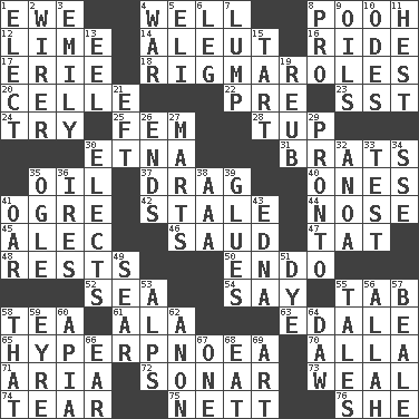 ACROSS 1. She-sheep 4. Not ill 8. "Silly old bear" 12. Welles in "The Third Man" 14. Eskimo relative 16. Travel on an animal 17. One of the Great Lakes 18. Frustrating wastes of time 20. Cell (Danish) 22. Before (prefix) 23. Fast jet (abbr.) 24. Attempt to accomplish something 25. Opposite of masc. 28. Uncastrated adult male sheep 30. Inactive volcano in Sicily 31. Naughty children 35. Lubricate 37. To be drawn or hauled along 40. Singles 41. Legendary monster 42. Lacking originality or spontaneity 44. Characteristic smell of wine 45. Actor Baldwin 46. Saudi Arabian king (1953-1964) 47. Make lace 48. Musical pauses 50. Inside; within (prefix) 52. Ocean 54. Declare 55. Keyboard key 58. Afternoon social gathering 61. According to 63. Peak District village in England 65. Abnormally rapid or deep breathing 70. Silent film actress Nazimova 71. Operatic vocal solo 72. Underwater navigation system 73. Welt 74. Rend 75. Remaining after all deductions 76. A female animal or person DOWN 1. Opt 2. One who wires 3. Poet Dickinson 4. Armed conflict 5. Biblical high priest 6. Part of a journey 7. Mass 8. Adept person 9. Petroleums 10. Lyric poems 11. Command 13. Snakelike fish 15. Small pie 19. Reuben's nickname 21. Bank Draft (abbr.) 26. Extremities 27. Shops 29. Right away 30. Chooses 32. Small Philippine buffalo 33. Trial 34. Compass dir. 35. Stare 36. Angers 38. American Automobile Association (abbr.) 39. Adhesives 41. Rowing implement 43. Pulitzer Prize-winning author Ferber 49. Wither 51. Color 53. High mountains 55. Lies 56. Assad's deity 57. Memphis, Tenn. Street 58. Not this but _ 59. Jane of fiction 60. Capital of Western Samoa 62. At once, immediately (arch.) 64. Obsolete 66. Hearing organ 67. Single 68. Erode 69. Tate display