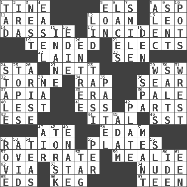 ACROSS 1. Prong on a fork 5. Raised railways 8. Viper 11. Length times width 12. Rich soil 13. Lion 14. Hyrax 17. Happening 19. Watched over 21. Opts 22. (Had) reclined 23. Elected rep. 24. R.R. building 27. Remaining after all deductions 29. Compass dir. 32. Singer Mel 34. Hit sharply and swiftly 36. Scorch 37. Capital of Western Samoa 38. Period 39. Diluted with white 40. For fear that 41. Double-curved letter 42. Pieces 43. Compass dir. 44. Slanted text style (abbr.) 46. Fast jet (abbr.) 47. Had dinner 50. Dutch treat 52. Food allowance for one day 55. Food holders 57. Make much ado about nothing 59. Ear of corn 62. By way of 63. Play the lead 64. Naked 65. Begley and Asner 66. Barrel 67. Adolescent DOWN 1. Small boy 2. Lyricist Gershwin 3. Egg locale 4. Artist's stand 5. Period of immesurable duration 6. Shoestrings 7. Grin 8. Actor Baldwin 9. Emitted 10. Plant holders 12. Hat (slang) 15. Lacking in sense or substance 16. Singer Brickell 18. Lair 20. Main course 24. Showing deterioration from age 25. Drinks excessively 26. Get up 28. Tarsus (plural) 29. Erodes 30. Table seasonings 31. Take or capture by force 33. Floor protector 35. Soft color 36. Health resort 42. Food holder 45. First man 47. Atmosphere 48. Cod relative 49. Related on the mother's side 51. Intended 52. Be footloose 53. Enthusiastic 54. Afternoon social gatherings 55. For each 56. Change direction abruptly 58. Label 60. Binary compound 61. Car or cant ending