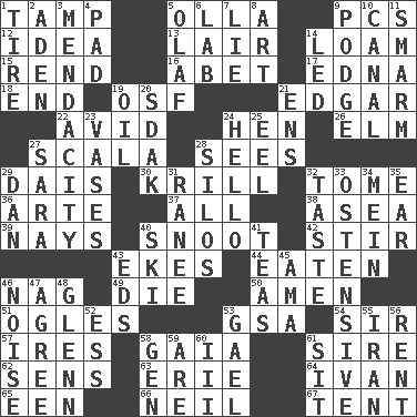 ACROSS 1. Pack (down) 5. Water jar 9. Personal Computers (abbr.) 12. The main thing one is thinking about 13. Den 14. Rich soil 15. Tear apart 16. Collude with 17. Pulitzer Prize-winning author Ferber 18. Conclusion 19. Order of Saint Francis (abbr.) 21. _ Allan Poe 22. Enthusiastic 24. Layer 26. Shade tree 27. Any of the three canals of the cochlea 28. Perceives with the eye 29. Raised platform 30. Shrimp-like planktonic crustaceans 32. Heavy book 36. Johnson of "Laugh-In" 37. Everything 38. At sea 39. Negative votes 40. Snob 42. Commotion 43. Supplements with great effort 44. Ingested 46. Tired old horse 49. Pass on 50. So be it 51. Stares at amorously 53. Girls' org. (abbr.) 54. Title for a knight 57. Angers 58. Greek goddess of the earth (variant) 61. Title for a man of rank and authority 62. Elected reps. 63. 4th largest of the Great Lakes 64. "Terrible" tsar 65. Car or cant ending 66. Famous astronaut Armstrong 67. Portable shelter DOWN 1. Hoop that covers a wheel 2. An important port of Yemen 3. Ananias' fault 4. Groovy apt. 5. Norwegian king 6. Experiment locale 7. Falsehood 8. Nonscientific branch of learning 9. Puddle 10. Lessep's creation 11. Excessive but superficial compliments 14. Directed 19. Lubricate 20. Neighbor of Neb. 21. Followers of ems 23. Flower holders 24. Phone greeting 25. Snakelike fish 27. "Two Mules for Sister ____" 28. Grain storage towers 29. Daniel's nick name 31. The wife of a rajah (variant) 32. Clothes sense 33. Clearly or manifestly demonstrative 34. Chow _ 35. Ewer handle 40. What Jean-Claude Killy likes to do 41. Afternoon social gatherings 43. Begley and Asner 45. Wet nurse (var.) 46. Annoying sound 47. Match 48. American astronaut and politician John 52. Double-curved letter 53. Highlander 55. SW Asia republic 56. Monthly bill 58. Commissioned mil. rank 59. "We ___ not amused" (Victoria) 60. One more than two 61. Be seated