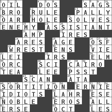 ACROSS 1. Petroleum 4. Two (Sp.) 7. Sinks 11. Sis' sibling 12. Governing power 13. Friendly 14. Boat paddle 15. Opening into or through something 16. Finds the solution 17. Foe 19. Helper 21. Electrical Unit 23. Angers 24. Ancient Greek god of war 25. Grow older 26. Order of Saint Francis (abbr.) 29. Take or capture by force 30. Followers of ems 31. Compete 32. Flowery wreath 33. Big collection agency 34. Shade tree 35. The grampus (Milton) 36. _-fi 37. Capital of Egypt 40. Afternoon social gathering 41. Area sheltered from the wind 42. Inconspicuous attention getter 43. Examine minutely or intensely 45. _ moment's notice (2 wds.) 46. Decision 51. Bert's buddy 55. Foolish or stupid persons 56. Cowardly lion portrayer 58. Compass dir. 59. Impressive in appearance 60. Greek god of love 61. 100% 62. Celtic language 63. Sep. follower 64. French article DOWN 1. Mitch Miller's instrument 2. SW Asia republic 3. Old wives' tales, e.g. 4. Superhero pair 5. Rounded earthenware pot or jar 6. Observes 7. Table seasonings 8. Inventor's middle name 9. Small, secluded valley 10. System (abbr.) 12. Poems 13. Airs 16. Founders of families 18. Female horse 20. Omens 22. Pacific Standard Time (abbr.) 24. N. Chile seaport 25. Nest on high 26. Unconcealed 27. Grain storage tower 28. Opposite of masc. 29. Past tense of be (plural) 32. Car dealer's back yard 33. Ancient Celtic tribe of eastern Britain 36. Narrow boards 37. Accounting whiz (abbr.) 38. Michaelmas daisies 39. Austrian river, tributary to the Danube 43. Took without asking 44. Quote 46. Trig term 47. Aroma 48. Chest bones 49. Butter sub 50. Drug cop 52. Be tempered by heat 53. Capri or Wright 54. Snakelike fish 57. Being at a high temperature