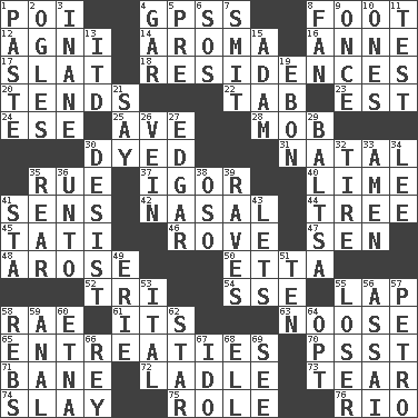 ACROSS 1. Luau course 4. Global Positioning Systems (abbr.) 8. Pick up the tab 12. Hindu god of fire 14. Odor 16. Singer Murray 17. Narrow board 18. Dwellings 20. Is inclined (to) 22. Keyboard key 23. Eastern Standard Time (abbr.) 24. Compass dir. 25. "___ Maria" 28. Disorderly crowd 30. Colored 31. Brizilian seaport 35. Sorrow 37. Composer Stravinsky 40. Welles in "The Third Man" 41. Elected reps. 42. Rhinal 44. Family _ (genealogy) 45. Jacques of French films 46. Be footloose 47. Elected rep. 48. Came up 50. Singer James 52. Three (prefix) 54. Compass dir. 55. Pet locale 58. Actress Charlotte 61. ___ a Wonderful Life 63. Trap for birds or small mammals 65. Pleas 70. Inconspicuous attention getter 71. Object of repulsion 72. Dipping utensil 73. Lacerate 74. Kill 75. Hero or heavy, e.g. 76. _ de Janeiro DOWN 1. Thick mixture 2. Stares at amorously 3. Empty; void 4. Slender fish 5. Before (prefix) 6. Distress signal 7. Stricken, poetically 8. Air blower 9. Single time 10. Washington bills 11. Trial 13. It would 15. First man 19. Inky black, to poets 21. Declare 26. Distinctive style or manner 27. _ Allan Poe 29. Greek mezzo-soprano Agnes 30. Stop 32. Hoop that covers a wheel 33. So be it 34. Area sheltered from the wind 35. Bring up, as a child 36. To (old English) 38. Bear (Spanish) 39. All-night dance parties 41. R.R. building 43. Allows 49. One of the Great Lakes 51. Nine, plus one 53. Slanted text style (abbr.) 55. Failure 56. Slender Brazilian palm 57. Stone: prefix 58. Confederate soldiers (slang) 59. Of or related to the anus 60. Inactive volcano in Sicily 62. Play the lead 64. Choose 66. Marina Del _, California 67. Wedding promise 68. Pipe bend 69. Observe