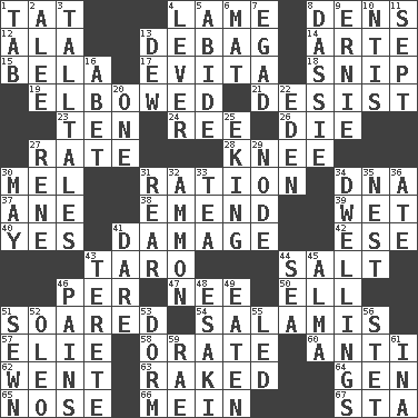 ACROSS 1. Make lace 4. Unable to walk 8. Lairs 12. Insect wing 13. Debunk (Brit. slang) 14. Johnson of "Laugh-In" 15. Actor Lugosi 17. Webber/Rice musical 18. Clip 19. Shoved, as through a crowd 21. Cease 23. "___ Little Indians" 24. To riddle 26. Expire 27. Pace 28. Leg joint 30. Cartoonist voice _ Blanc 31. Food allowance for one day 34. Heredity factor (abbr.) 37. A saturated hydrocarbon 38. Make improvements or corrections to 39. Soggy 40. Consenting reply 41. Break 42. Compass dir. 43. Edible starchy tuberous root 44. Table seasoning 46. For each 47. Born 50. Pipe bend 51. Flew 54. Deli grouping 57. Writer Wiesel 58. Declaim 60. Opposed to 62. Gone 63. Moved through 64. Commissioned military rank (abbr.) 65. Sense of smell 66. Chow _ 67. R.R. building DOWN 1. Keyboard key 2. Toward shelter 3. Baron Munchausen's specialties 4. Crowbar 5. Stay 6. Floor protector 7. Mild oath 8. Small ungulate mammals of Africa 9. Bert's buddy 10. Nuclear Threat Initiatives 11. Back-to-school mo. 13. Morning condensation 16. Collude with 20. Single 22. Paradise 25. Supplementing with great effort 27. French philosopher Descartes 29. Connecting point 30. Can I? 31. Hitchcock's "____ Window" 32. ID or VA city 33. Afternoon social gathering 34. Homes 35. Egg locale 36. Had dinner 41. Have the gumption 43. Cigar-shaped 44. Ocean 45. _ mater 46. Aches 48. 1973 Nobel Price Winner (Physics) Leo 49. Consumed 51. Stitched 52. Margarine 53. Dormintory (informal) 55. Directed 56. Proofreading order 59. Actress Charlotte 61. _ tizzy (2 wds.)