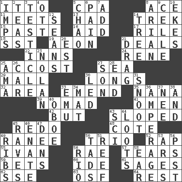 ACROSS 1. "Tell ____ the Marines!" 5. Accounting whiz (abbr.) 8. Adept person 11. Confronts 13. Possessed 14. Long journey 15. Thick mixture 16. Assist 17. Cause heat under the collar 18. Fast jet (abbr.) 19. Age 21. Allots cards 22. Restaurants 24. French philosopher Descartes 25. Buttonhole 27. Ocean 29. Promenade 30. Yearns 32. Length times width 33. Make improvements or corrections to 35. Grandmother 39. Wanderer 41. Presage 42. With the exception that 43. Slanted 45. Redecorate 48. ____ d'Azur (French Riviera) 49. Indian princess (variant) 50. Musical group of three 52. Reproach for some lapse or misdeed 55. _ the terrible 56. Actress Charlotte 57. Rends 59. Antes 60. Binary compound 61. Gurus 62. Compass dir. 63. Order of Saint Francis (abbr.) 64. Remainder DOWN 1. Naughty children 2. Afternoon social gatherings 3. A testis 4. Baseball player Mel 5. US Secretary of Labor Elaine L. _ 6. Ache 7. Find the sum of 8. Believer in; advocate of (suffix) 9. Cell (Danish) 10. Makes supply last 12. Actors Connery and Penn 14. Woody plant 20. Eastern Standard Time (abbr.) 21. To be drawn or hauled along 23. Pitcher Ryan 25. Housemaid (var.) 26. 4-wheeled motor vehicle 27. Male offspring 28. Conclude 30. Directed 31. Snout, nose 33. Australian flightless bird 34. Floor covering 36. Electrical Measurement 37. Born 38. Added to 40. Mitch Miller's instrument 43. _-fi 44. Plunders 45. All-night dance parties 46. Maternal 47. Hiding places for outlaws 49. Teases 50. Small boys 51. Coral ridge 53. Ancient Greek god of war 54. Inconspicuous attention getter 56. River (Sp.) 58. Hearing organ