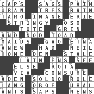 ACROSS 1. Smile enhancers 5. Sinks 9. Ache 13. NW Algerian seaport 14. Angers 15. Precipitation 16. Pacific island yam 17. Silly 18. 4th largest of the Great Lakes 19. Slender, wiry 21. Bear (Spanish) 22. Lug 23. Smile widely 24. Added to 27. Allow head to fall sleepily 28. Frog relative 29. Women servants 31. E Mali city 32. Inactive volcano in Sicily 36. Afresh 37. Possessed 38. Famous astronaut Armstrong 39. Dwelling 40. Lair 41. Having lost freshness 42. (Had) reclined 44. Followers of ems 46. Observe 47. Otherwise 48. Roll call or roster of names 50. By way of 51. Eat 54. An important port of Yemen 56. Twentieth part of a lira 58. Hero or heavy, e.g. 60. Long (Scottish) 61. Mitch Miller's instrument 62. Mountain range 63. Pismires 64. Plant excrements 65. Not women's DOWN 1. Small bed 2. Caspian sea tributary 3. Role in a play 4. Derisive sound 5. Burned superficially 6. Like ___ of sunshine 7. Commissioned mil. rank 8. Compass dir. 9. Elected leader of a country 10. Composer Copland 11. One more than two 12. Compass dir. 17. To the inside or interior of 20. Charged particles 21. Mouth or opening 23. Thick or sticky substance 24. Nanny 25. Billionth: prefix 26. South Vietnam president (1954) 28. Bit 30. Homes 31. Separate the seeds from cotton 33. Afternoon social gatherings 34. Mediterranean tributary 35. Toward shelter 37. Layer 40. Expire 41. Fast planes 43. White ___ sheet 44. Eats (away) 45. Words to Nanette 47. Incident 49. Gold (Symbol: Au) 51. Hoof sound 52. Greater amount 53. Style 54. Insect wing 55. Daniel's nick name 56. Distress signal 57. Chief or king in Benin or Nigeria 59. Raised railways