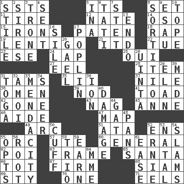 ACROSS 1. Fast planes 5. It is 8. Arrange properly for use 11. Hoop that covers a wheel 12. Nathan's nickname 14. Bear (Spanish) 15. Removes the wrinkles 17. Eucharist need 18. Reproach for some lapse or misdeed 19. Small, flat, pigmented spot on the skin 21. It would 22. Third day of the wk. 23. Compass dir. 24. Infant locale 25. Fr. "Yes" 27. Snakelike fish 28. A whole individual unit 31. Scottish caps 35. Cards in a Roman deck? 37. The longest river in the world 38. Presage 39. Dreamland 41. Frog relative 42. Went 43. Tired old horse 45. Singer Murray 46. Assistant 47. Atlas unit 49. Curve 51. _ moment's notice (2 wds.) 52. Followers of ems 55. The grampus (Milton) 57. Shoshoni 60. Commissioned military rank 62. Luau course 63. Movie unit 65. Before Barbara or Clara 66. Small child 67. Become taut 68. Thailand, formerly 69. Filthy place 70. Single 71. Snakelike fish DOWN 1. Vertical member of a panel or frame 2. Titles for men of rank and authority 3. Heavy duty weighing machine 4. Emitted 5. _ tizzy (2 wds.) 6. Jacques of French films 7. Proofreading order 8. Making a chance decision by using lots 9. He sold his birthright 10. Drink excessively 13. Inside; within (prefix) 16. Filth; sediment 17. Cotton for raincoats, e.g. 20. Highlander 26. National forest in Provo, Utah 29. Style 30. Ancient Persian 31. Ancient Roman robe 32. Mine, in Marseilles 33. Ananias' fault 34. Scornful expression 36. Electrically charged atom 40. Break 44. Yard entry 48. Zero-star reviews 50. _ links 52. Bert's buddy 53. Brizilian seaport 54. Hits or strikes with great force 55. Chooses 56. Carrot, for example 58. Musical group of three 59. Merit 61. Comfort 64. Madame (abbr.)