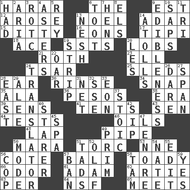 ACROSS 1. Ethiopian city, capital of Harari 6. Definite Article 9. Eastern Standard Time (abbr.) 12. Came up 13. Christmas carol 14. The sixth month of the Jewish calendar 15. Simple song 16. Immeasurably long periods of time 17. Native american tent (variation) 18. Adept person 19. Fast planes 20. Tennis shots 21. Writer of Portnoy's Complaint (1969) 23. Pipe bend 24. Russian ruler of old 25. Bobsleighs 28. Ewer handle 30. Remove soap 34. Fastener 35. According to 36. Mexican monetary units 38. Period 39. Elected reps. 41. Portable shelters 43. Elected rep. 44. Trials 46. Lubricates 48. Infant locale 49. Corncob 50. Hindu Mythology: god of death 51. Torque (variant) 53. Compass dir. 56. ____ d'Azur (French Riviera) 57. Indonesian resort city 58. Sycophant 60. Scent 61. First man 62. Nick name for Arthur 63. For each 64. Overdraft (abbr.) 65. Confronts DOWN 1. Possessed 2. Operatic vocal solo 3. College mil. group 4. Michaelmas daisies 5. Marina Del _, California 6. A blast of a horn 7. Coop moms 8. Raised railways 9. The property of being fit to eat 10. Plant excrements 11. Three (prefix) 13. Delicate 14. Ringlike coral islands and reefs 19. Remove all contents or possession from 20. French article 22. Rowing implement 24. Interpreter 26. Have the gumption 27. Connect, as a bridge 28. Compass direction 29. Toward shelter 31. Fish or hair follower 32. Compass dir. 33. Period of immesurable duration 37. Unemotional 40. A viewer who gazes fixedly 42. Small drink 45. Health resort 47. Poe poem 49. Demure 50. Method 51. Small boys 52. Norwegian king 54. Nathan's nickname 55. Prepare for publication 56. Police officer (slang) 57. Forbid 58. Scottish cap 59. It is so
