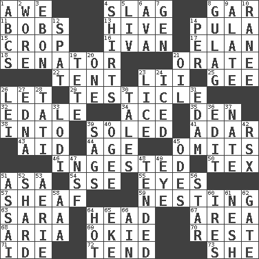 ACROSS 1. Deep reverence 4. Volcanic refuse 8. Slender fish 11. Moves up and down 13. Hub of activity 14. Monetary unit of Botswana 15. Riding implement 16. "Terrible" tsar 17. Flair 18. Elected representative 21. Declaim 22. Portable shelter 23. Cards in a Roman deck? 25. Unit of force equal to gravity 26. Allow 29. One of the two male reproductive glands 32. Peak District village in England 34. Adept person 35. Lair 38. To the inside or interior of 39. Having a sole or soles 41. The sixth month of the Jewish calendar 43. Help 44. Mature 45. Leaves out 46. Consumed 50. John Ritter's dad 51. White ___ sheet 54. Compass dir. 55. Sight organs 57. To gather and bind into a bundle 59. Snuggling 63. "Two Mules for Sister ____" 64. Froth on beer 67. Type of rug 68. Operatic vocal solo 69. Migrant worker of the '30s 70. Take ten 71. Binary compound 72. Be inclined (to) 73. A female animal or person DOWN 1. Lettered men learn these first 2. Had on 3. Inky black, to poets 4. Chest coverings 5. 54 in ancient Rome 6. Actress Gardner 7. Commissioned military rank (abbr.) 8. Russian prison camp 9. Having winglike extensions 10. The wife of a rajah (variant) 12. Petty quarrel 14. For each 19. False hair 20. Single 21. Lubricate 23. Louse (plural) 24. On the rocks 26. Luau accessory 27. Pulitzer Prize-winning author Ferber 28. Jacques of French films 30. Falsehoods 31. Dutch treat 33. Farming town in central California 36. Prepare for publication 37. Nathan's nickname 39. Sinks 40. Double curve, resembling the letter S 42. Acura sports coupe 45. Lyric poems 47. Overdraft (abbr.) 48. Watched over 49. Sight organ 51. Slender Brazilian palm 52. Broken piece 53. Nest on high 56. Play the lead 58. American Automobile Association (abbr.) 60. Angers 61. Delicate 62. Yard entry 64. Being at a high temperature 65. Supplement with great effort 66. The 18th letter of the Arabic alphabet