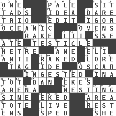 ACROSS 1. Single 4. Light colored 8. Be seated 11. Small amounts or degrees 13. The main thing one is thinking about 14. Have the gumption 15. Musical group of three 16. Prepare for publication 17. Composer Stravinsky 18. Pertaining to the sea 21. Baking chambers 22. Libertine 23. Cards in a Roman deck? 25. Compass dir. 26. Had dinner 29. One of the two male reproductive glands 32. Distance measurement (Brit.) 34. One (Scot) 35. Connecticut Ivy Leaguer 38. Opposed to 39. Swept the length of 41. Old wives' tales, e.g. 43. Label 44. Binary compound 45. Motion picture award 46. Swallowed 50. _ tizzy (2 wds.) 51. Small child 54. Forbid 55. Makes supply last 57. Sports stadium 59. Snuggling 63. Trig term 64. Supplemented with great effort 67. Length times width 68. Haul 69. Not recorded 70. Respite 71. Followers of ems 72. Hurried 73. A female animal or person DOWN 1. "Beetle Bailey" pooch 2. Drug cop 3. Singer Brickell 4. Components 5. Increase 6. Flowery wreath 7. Consume 8. Gurus 9. Removes the wrinkles 10. Laconic 12. Fly high 14. HTML Container Element 19. Nathan's nickname 20. Mamie's husband 21. Lubricate 23. Actor's bit 24. On the rocks 26. Nanny (var.) 27. Portable shelter 28. Singer James 30. Receives possession of 31. Snakelike fish 33. Swiss mountan, "Queen of the Mountains" 36. Venues 37. SW Asia republic 39. Port city in Latvia 40. An important port of Yemen 42. Epoch 45. Lyric poems 47. Basketball assoc. 48. Looked after 49. Supplement with great effort 51. Clothes sense 52. Greek mythologigal hunter 53. Portable shelters 56. Play the lead 58. Born 60. Angers 61. Soft 62. Yard entry 64. Raised railways 65. Monetary unit of Laos 66. Night before a holiday