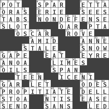 ACROSS 1. Plant holder 4. Coast Guard woman 8. Singer James 12. Mouths or openings 14. One of the Great Lakes 15. Observes 16. Bar bills 17. Unrelated to defense, as in spending 20. Position in a hierarchy or organization 21. Boat paddle 22. Parent Teacher Assoc. 23. Motion picture award 27. Be footloose 29. Among 31. Queen of England 1702-14 34. Showing deterioration from age 35. Overwhelm 36. Open wide 39. Erode 41. Jane of fiction 42. Small Philippine buffalo 43. Citrus fruits 46. Lubricates 47. Connect, as a bridge 48. Adolescent 51. Ancient Celtic tribe of eastern Britain 54. Slender fish 56. Allow 58. Lyric poems 61. Conciliate 66. Small valley 67. Portico 68. Nuclear Threat Initiatives 69. Comfort 70. Post 71. Without 72. Directed DOWN 1. Cooking vessels 2. Of the mouth 3. Off limits 4. Elected rep. 5. Adept person 6. The 18th letter of the Arabic alphabet 7. Do over again 8. Compass dir. 9. 3-inch nail 10. Trial 11. Toward the sea 13. Fast planes 18. Hearing organ 19. Away 24. Domesticated feline 25. Wet nurse (var.) 26. Cause heat under the collar 28. Flower holders 30. Allots cards 32. Not either 33. She-sheep 34. Gospel singer Marvin 36. E Mali city 37. Black tropical American cuckoo 38. Coward 40. Native american tent (variation) 44. Apple computer (short form) 45. Compass dir. 49. Connecticut Ivy Leaguer 50. Fish or hair follower 52. Connecting point 53. Perfect 54. Global Positioning Systems (abbr.) 55. Johnson of "Laugh-In" 57. Airtight sealed metal containers 59. Otherwise 60. Downhill vehicle 62. Writing tablet 63. _ moment's notice (2 wds.) 64. Metal container 65. Curvy letter