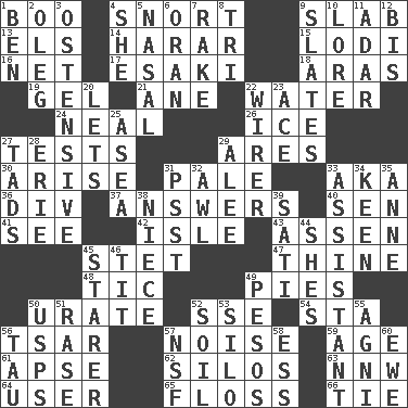 ACROSS 1. Oct. 31 cry 4. Derisive sound 9. Thick slice 13. Raised railways 14. Ethiopian city, capital of Harari 15. Farming town in central California 16. Fish or hair follower 17. 1973 Nobel Price Winner (Physics) Leo 18. Ancient river in northeast Turkey 19. Set 21. A saturated hydrocarbon 22. Wetness 24. Actress Patricia 26. Frozen water 27. Trials 29. Ancient Greek god of war 30. Originate 31. Diluted with white 33. Alias (abbr.) 36. HTML Container Element 37. Responds (to) 40. Elected rep. 41. Observe 42. Small island 43. NE Netherlands city 45. Proofreading order 47. One or ones belonging to thee 48. Nervous spasm 49. Sliced desserts 50. A salt of uric acid 52. Compass dir. 54. R.R. building 56. Russian ruler of old 57. Annoying sound 59. Mature 61. Domed church section 62. Grain storage towers 63. Compass dir. 64. One who uses or employs something 65. Soft thread for cleaning between teeth 66. Standoff DOWN 1. Benjamin's nick name 2. Cassini of fashion 3. Clearly or manifestly demonstrative 4. A female animal or person 5. Relating to the nose 6. NW Algerian seaport 7. Libertine 8. Three (prefix) 9. Chalkboards 10. Old wives' tales, e.g. 11. The sixth month of the Jewish calendar 12. Altar cloth linen 20. Allows 22. One who wires 23. Adept person 25. At sea 27. Small amounts or degrees 28. 4th largest of the Great Lakes 29. Toward shelter 31. Inconspicuous attention getter 32. Leather borer 33. Helper 34. Peachy ____! 35. Queen of England 1702-14 38. Sibling's daughter 39. Suttee (variant) 44. "______ My Girl" (Turtles hit) 45. A viewer who gazes fixedly 46. Teat (slang) 49. Mexican monetary units 50. United States Postal Service (abbr.) 51. Raze (variant) 52. The visible part of the earth's surface 53. Grain storage tower 55. Hindu god of fire 56. The 19th letter of the Greek alphabet 57. Science/research agcy. 58. Curvy letter 60. She-sheep