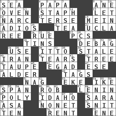ACROSS 1. Ocean 4. Dad 8. One (Scot) 11. Baking chamber 13. Staphylococcus 15. Allow 16. Drug cop 17. Laconic 18. Count _ (2 wds.) 19. Goodbye (Sp.) 21. Afternoon social gathering 22. Southern CA. univ. 23. Portuguese money of account (variant) 24. Regret 27. Personal Computers (abbr.) 29. Airtight sealed metal containers 30. Debunk (Brit. slang) 34. Purpose 36. "Tell ____ the Marines!" 39. Showing deterioration from age 40. SW Asia republic 41. Pulls apart 43. Family _ (genealogy) 44. Grayish beige 46. Mild oath 47. Compass dir. 48. Tree or shrub in the Birch family 49. Labels 51. Tired old horse 53. Make supply last 54. Eisenhower's nickname 57. Connect, as a bridge 60. Director Reiner 63. Soviet premier 1918-24 65. Many (prefix) 66. Potato state 69. "Two Mules for Sister ____" 70. White ___ sheet 71. Music written for nine 72. In a ____ (agitated or irritated) 73. "___ Little Indians" 74. Monthly bill 75. Compass dir. DOWN 1. Echolocation 2. Elude 3. Nest on high 4. Pacific Standard Time (abbr.) 5. Had dinner 6. Role in a play 7. Domed church section 8. Actor Baldwin 9. Famous astronaut Armstrong 10. Inactive volcano in Sicily 12. Non-commissioned officer (abbr.) 14. Pile 18. French bagpipes 20. _ Lanka 25. A single undivided whole 26. First name in cosmetics 28. Music discs 29. 3-inch nail 31. Long, evenly shaped pieces 32. Toward shelter 33. Turn to the right 34. Mountain range 35. Saudi Arabian king (1953-1964) 37. Label 38. Declaim 40. Call ___ day 42. Neighbor of Neb. 45. Epoch 50. Set 52. Broad smile 54. Silly 55. Japanese brewing company 56. Related on the mother's side 57. Petty quarrel 58. Airs 59. ____ Jay Lerner 61. Aroma 62. Object of repulsion 64. Curvy letter 67. Layer 68. Baseball player Mel