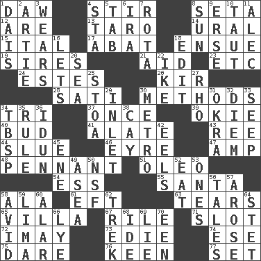 ACROSS 1. Fool 4. Disorderly outburst 8. Stalk of a moss capsule 12. "We ___ not amused" (Victoria) 13. Pacific island yam 14. Mountain range 15. Slanted text style (abbr.) 17. Blind as ____ 18. Take place subsequently 19. Male parents of animals 21. Assist 23. And so on (abbr.) 24. _____ Park, CO 26. Apertif with cassis 28. Suttee (variant) 30. Modes 34. Three (prefix) 37. At one time in the past 39. Migrant worker of the '30s 40. Partially opened flower 41. Having winglike extensions 43. To riddle 44. Change direction abruptly 46. Jane of fiction 47. Electrical Unit 48. Pre-World Series prize 51. Margarine 54. Double-curved letter 55. Before Barbara or Clara 58. According to 61. Newt 63. Separates forcefully 65. Country estate 67. Cause heat under the collar 71. Notch 72. "If ____ say so..." 73. Singer Brickell 74. Compass dir. 75. Have the gumption 76. Peachy ____! 77. Arrange properly for use DOWN 1. Raised platform 2. Nick name for Arthur 3. Erodes 4. R.R. building 5. Bar bill 6. Lyricist Gershwin 7. Round or rotation of duties 8. Player for Phoenix 9. Celtic language 10. Strained 11. Actor Baldwin 16. Allows 18. Prepare for publication 20. Ocean 22. Mamie's husband 25. Portico 27. 17th letter of the Greek alphabet 29. An arm off of a larger body of water 30. Paris' subway 31. Gumbo ingredient 32. South Vietnam president (1954) 33. Ooze 34. Cook's measure (abbr.) 35. Governing power 36. Goddess of spring and wife of Bragi 38. Island 42. Snakelike fish 45. Compass dir. 49. At sea 50. Science/research agcy. 52. Erode 53. Singles 56. Lies 57. Came up 58. Enthusiastic 59. Pale green bean 60. Having or resembling wings 62. Long journey 64. Proofreading order 66. Sodium hydroxide 68. Binary compound 69. Whopper 70. Car or cant ending