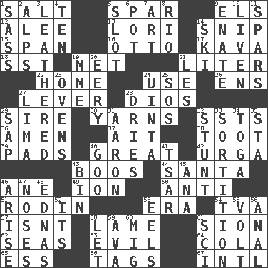 ACROSS 1. Table seasoning 5. Practice fight 9. Raised railways 12. Toward shelter 13. Australian parrot (variant) 14. Sever or remove by pinching or nipping 15. Connect, as a bridge 16. "Beetle Bailey" pooch 17. Polynesian shrub of the pepper family 18. Fast jet (abbr.) 19. Was introduced to 21. 61 cubic inches 22. Dwelling 24. Purpose 26. Followers of ems 27. Prying instrument 28. "Vaya con ____" 29. The founder of a family 30. Tall tales 32. Fast planes 36. So be it 37. Small island 38. A blast of a horn 39. Groovy apts. 40. Relatively large 42. Capital and largest city of Mongolia 43. Scornful sounds 44. Before Barbara or Clara 46. One (Scot) 49. Electrically charged atom 50. Against 51. "The Thinker" sculptor 53. Period 54. Federal power corp. 57. Is not 58. Unable to walk 61. The Jewish people; Israel 62. Oceans 63. Morally bad or wrong 64. Root beer relative 65. Curvy letter 66. Labels 67. International (abbr.) DOWN 1. Backtalk 2. High mountains 3. Tough but pliablecoriaceous 4. Nine, plus one 5. Position in a hierarchy or organization 6. Cooking vessel 7. Tate display 8. River (Sp.) 9. Related on the mother's side 10. Make or become more lively 11. Practice fights 14. What Jean-Claude Killy likes to do 19. Madame (abbr.) 20. Suggestive of the supernatural 21. French article 23. Baking chambers 24. National forest in Provo, Utah 25. Mayday 27. Pale green bean 28. Frees from moisture 29. Plant excrement 31. Composer Copland 32. Difficult or unusual or dangerous feat 33. Casting lots 34. Ancient Roman robe 35. R.R. building 40. Thick or sticky substance 41. Russian ruler of old 43. Storage container 45. Santa ___, CA 46. Ascend 47. Olfactory organs 48. Ferber et al. 52. ___ a Wonderful Life 53. Snakelike fish 55. Electrical Unit 56. Of or related to the anus 58. Allow 59. Actress Gardner 60. Russian fighter aircraft 61. _-fi