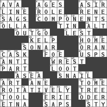 ACROSS 1. Actress Gardner 4. Ripens 8. SW Saudi Arabia district 12. Actor's bit 14. Hero or heavy, e.g. 15. French philosopher Descartes 16. Droops 17. Parts 20. Water jar 21. Metal container 22. The first octave above the treble staff 23. Expenditure 27. For fear that 29. Seaweed 31. Residence 34. Echolocation 35. NW Algerian seaport 36. Keg 39. Enemy 41. United States Postal Service (abbr.) 42. Against 43. Obtain by seizing forcibly or violently 46. Piece 47. Spoils 48. Toward the sea 51. Slow-paced one 54. Tate display 56. A saturated hydrocarbon 58. Heavy book 61. Rotating or pertaining to rotation 66. Woody plant 67. Instrument 68. 4th largest of the Great Lakes 69. River in Europe 70. Inactive volcano in Sicily 71. Plant excrements 72. Filthy place DOWN 1. In addition 2. Small bottle 3. White American of non-Hispanic descent 4. Curve 5. Thick or sticky substance 6. Shade tree 7. Back-to-school mo. 8. "We ___ not amused" (Victoria) 9. Elected representatives 10. International (abbr.) 11. Respite 13. Son of Isaac 18. Lubricate 19. Compass dir. 24. Ring climax 25. Commissioned military rank (abbr.) 26. Norwegian king 28. Yell 30. Move like a hungry wolf 32. Atlas unit 33. Followers of ems 34. Burlesque acts 36. Head covering 37. Santa ___, CA 38. Ski resort town in Vermont 40. Greek god of love 44. Period of immesurable duration 45. R.R. building 49. Erode 50. Cuckoo 52. "Tell ____ the Marines!" 53. Titled peers of a realm 54. Johnson of "Laugh-In" 55. Carrot, for example 57. Nights before holidays 59. Confront 60. Suggestive of the supernatural 62. According to 63. Period 64. Mouth edge 65. Affirmative reply