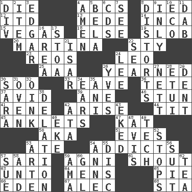 ACROSS 1. Pass on 4. Lettered men learn these first 8. Passed on 12. It would 13. Ancient Persian 14. South American Indian 15. Viva Las _ 18. Otherwise 19. Oscar Madison type 20. Chrissie's court nemesis 22. Filthy place 23. Vintage cars 24. Lion 25. Auto club (abbr.) 26. Had a strong desire 30. "Barney Miller" actor Jack 33. Break or tear apart 36. Wig 37. Enthusiastic 39. A saturated hydrocarbon 40. Astound 41. French philosopher Descartes 42. Ascend 44. Teat (slang) 45. Short socks 47. Krazy ___ of comics 50. Alias (abbr.) 51. Nights before holidays 53. Had dinner 54. Inveterate users 57. Indian skirt 59. Hindu god of fire 61. Yell 63. To (old English) 64. Not women's 65. Sliced dessert 66. Paradise 67. Actor Baldwin 68. R.R. building DOWN 1. HTML Container Element 2. A distinct part 3. _ Allan Poe 4. So be it 5. Actor Lugosi 6. Music discs 7. Perceive with the eye 8. What propaganda does 9. Inwardly 10. Environmental prefix 11. Apply (a substance) by light strokes 16. Length times width 17. Portico 21. Austrian river, tributary to the Danube 22. Ocean 24. Area sheltered from the wind 26. Jacques Cousteau's middle name 27. Remaining after all deductions 28. Needle case 29. Incision 30. "Two Mules for Sister ____" 31. Baking chamber 32. Pig sound 34. Hearing organs 35. Black tropical American cuckoo 38. Conveyance 42. _ moment's notice (2 wds.) 43. Supplemented with great effort 46. Make supply last 48. Advice 49. Georgia ____ (Atlanta school) 52. Halts 53. Johnson of "Laugh-In" 54. Queen of England 1702-14 55. Plate 56. Set or collection 57. Take to court 58. Plus 59. Housemaid (var.) 60. Set 62. Beverage made from leaves