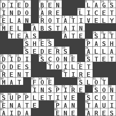 ACROSS 1. Passed on 5. Benjamin's nick name 8. Straggles 12. Southeast Asian peninsula 13. "We ___ not amused" (Victoria) 14. It is permitted: Lat. 15. Enthusiasm 16. Happening in regular succession 19. Cartoonist voice _ Blanc 20. Refrain by choice 21. Afternoon social gatherings 23. Had dinner 24. Be seated 27. "______ My Girl" (Turtles hit) 30. Romantic infatuation 31. Spring feasts 34. Silent film actress Nazimova 35. "You Light Up My Life" star Conn 38. Biscuitlike quick bread 40. Proofreading order 41. Lyric poems 42. Rest room 44. Monthly bill 45. Hoop that covers a wheel 46. Floor protector 47. Enemy 50. Position in a hierarchy or organization 53. Heighten or intensify 57. Manchild 59. Supplementary 63. Native of Scotland 64. Maternal 65. Baking dish 66. "Change" in Tahitian 67. Opera by Verdi 68. Compass dir. 69. Ancient Greek god of war DOWN 1. South Vietnam president (1954) 2. An arm off of a larger body of water 3. Peak District village in England 4. Spanish title 5. Sharp remark 6. Greek god of love 7. Remaining after all deductions 8. 54 in ancient Rome 9. Adept person 10. Set 11. Filthy place 14. Actor's bit 17. American Automobile Association (abbr.) 18. Teat (slang) 20. American tennis player Robert 22. Help 24. Table seasoning 25. Small island 26. Not this but _ 28. Begley and Asner 29. Religious group 30. Soft color 32. Friend of Pooh 33. In a ____ (agitated or irritated) 35. Dormintory (informal) 36. The content of cognition 37. Scratch 39. Connecticut Ivy Leaguer 43. Celtic language 47. Do some clerical work 48. Single 49. Eastern Standard Time (abbr.) 51. Witty Wilde 52. Woman's close-fitting hat 54. Corncob 55. _ the terrible 56. French philosopher Descartes 58. Nuclear Threat Initiatives 59. Ocean 60. University (slang) 61. Writing tablet 62. Parent Teacher Association (abbr.) 63. R.R. building