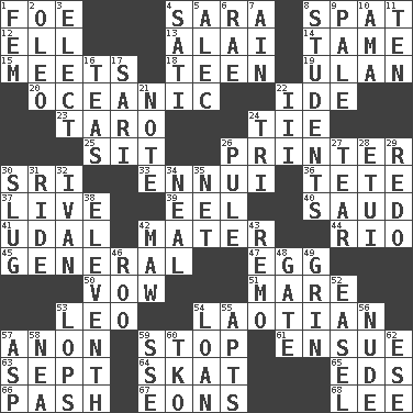 ACROSS 1. Enemy 4. "Two Mules for Sister ____" 8. Petty quarrel 12. Pipe bend 13. Mountain range southwest of Kyrgyzstan 14. Docile 15. Confronts 18. Adolescent 19. ____ Bator, Mongolia 20. Pertaining to the sea 22. Binary compound 23. Pacific island yam 24. Standoff 25. Be seated 26. Hard copy producer 30. Indian title of respect (Mr.) 33. World-weariness 36. False hair 37. Moving, as bait 39. Snakelike fish 40. Saudi Arabian king (1953-1964) 41. Hereditary estate 42. Mother 44. _ de Janeiro 45. Commissioned military rank 47. Oval reproductive body of a fowl 50. Solemn pledge 51. Female horse 53. Lion 54. Of or relating to Laos or its people 57. Soon (poet.) 59. Constrict 61. Take place subsequently 63. Back-to-school mo. 64. Three-handed card game 65. Begley and Asner 66. Romantic infatuation 67. Immeasurably long periods of time 68. Area sheltered from the wind DOWN 1. Opposite of masc. 2. Butter sub 3. Voters do this 4. Suttee (variant) 5. Actor Baldwin 6. Actress Charlotte 7. The 18th letter of the Arabic alphabet 8. SAT takers 9. Light colored 10. Wet nurse (var.) 11. "___ Little Indians" 16. Beverages made from leaves 17. Indian skirt 21. Make mention of 22. One more than two 24. Three (prefix) 26. Whimper 27. Pull into pieces 28. Needle case 29. Make new 30. Snaillike creature with no shell 31. Travel on or in a vehicle 32. "Terrible" tsar 34. Anneal 35. Fish or hair follower 38. Veterans Day date 42. Opening into something insatiable 43. San ____ (Riviera town) 46. Friend of Pooh 48. Yard entry 49. Smile widely 52. Artist's stand 53. Chops off 54. Grant temporary use of 55. Flats, for short 56. Unadorned 57. Cleo's killer 58. Teachers' org. 59. Compass dir. 60. Ring climax 62. Compass dir.