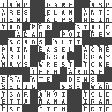 ACROSS 1. Pack (down) 5. Have the gumption 9. Cleo's killer 12. Ancient Greek god of war 13. Liveliness 14. Opposed to 15. Painter Guido (1575-1642) 16. High mountains 17. It's straight from the horse's mouth 18. Small amount or degree 19. For each 21. Lacking originality or spontaneity 22. The sixth month of the Jewish calendar 24. Luau course 26. Marina Del _, California 27. Large numbers or amounts 28. Came down and settled, as after flight 29. Ache 30. Artist's stand 32. Land measure 36. Johnson of "Laugh-In" 37. Girls' org. (abbr.) 38. Supercomputer manufacturer 39. Negative votes 40. Obtain by seizing forcibly or violently 42. Puff or smoke 43. Adolescent 44. Came up 46. Epoch 49. Had dinner 50. Cub Scout units 51. Major League Baseball Commissioner Bud 53. Compass dir. 54. Armed conflict 57. Russian ruler of old 58. Mine, in Marseilles 61. Lacquered or enameled metalware 62. Singer James 63. Grandmother 64. SW Asia republic 65. Compass dir. 66. A distinct part 67. Singer Brickell DOWN 1. Small pie 2. Length times width 3. Ananias' fault 4. Air pressure measure (abbr.) 5. Letter starter 6. Everything 7. Hit sharply and swiftly 8. Followers of ems 9. Approach 10. Vertical member of a panel or frame 11. Abounding in pines 14. Nonscientific branch of learning 19. Writing tablet 20. Celtic language 21. Be seated 23. Natives or inhabitants of Denmark 24. Entreaties 25. Petroleum 27. "Two Mules for Sister ____" 28. NE Netherlands city 29. Baking dish 31. Match 32. 13-14th century defensive garment 33. What you're doing now 34. Immoral or dissolute person 35. Sight organ 40. Dripping 41. Small amounts or degrees 43. Label 45. To separate or throw off 46. First name in cosmetics 47. Musical pauses 48. Having winglike extensions 52. Lyricist Gershwin 53. Thailand, formerly 55. Mountain range southwest of Kyrgyzstan 56. French philosopher Descartes 58. Black tropical American cuckoo 59. Floor protector 60. Single 61. Neckwear