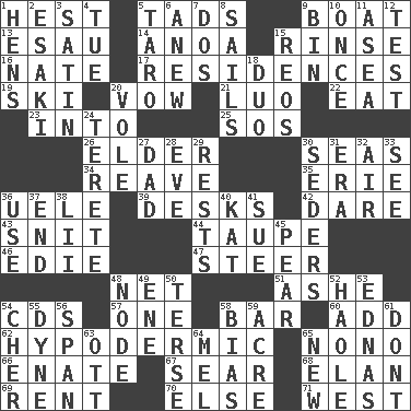 ACROSS 1. Command 5. Bits 9. Water vessel 13. He sold his birthright 14. Small Philippine buffalo 15. Remove soap 16. Nathan's nickname 17. Homes 19. What Jean-Claude Killy likes to do 20. Promise 21. Nilotic language 22. Erode 23. To the inside or interior of 25. Mayday 26. A person who is older than you are 30. Oceans 34. Break or tear apart 35. One of the Great Lakes 36. Ubangi River tributary 39. Writing tables 42. Have the gumption 43. In a ____ (agitated or irritated) 44. Grayish beige 46. Singer Brickell 47. Navigate 48. Fish or hair follower 51. American tennis player Robert 54. Music discs 57. Single 58. Oblong piece of solid material 60. Increase 62. Subcutaneous 65. Words to Nanette 66. Related on the mother's side 67. Dry up 68. Enthusiasm 69. Monthly bill 70. Otherwise 71. Compass direction DOWN 1. Coop moms 2. 1973 Nobel Price Winner (Physics) Leo 3. Smooth fabric 4. Third day of the wk. 5. Edible starchy tuberous root 6. Afresh 7. Two (Sp.) 8. Travel by water 9. Storage container 10. Single time 11. At sea 12. Trial 15. Vintage cars 18. Superhero pair 20. Short-tailed, large-bodied rat 24. Cigar-shaped 27. Male parent 28. Night before a holiday 29. Musical pauses 30. Spring feasts 31. Epoch 32. Wind 33. Perceive with the eye 36. Purpose 37. Conclude 38. Cards in a Roman deck? 40. Krazy ___ of comics 41. Take to court 45. Lightbulb-shaped fruit 48. Thickened enlargement 49. Compass dir. 50. Laconic 52. White Person, in Hawaii 53. Ferber et al. 54. "Mermaids" star 55. Centimeter-gram-second unit of force 56. Connect, as a bridge 58. Prejudice 59. Land measure 61. Do not 63. Baseball player Mel 64. Cartoonist voice _ Blanc 65. ___ Haven, CT