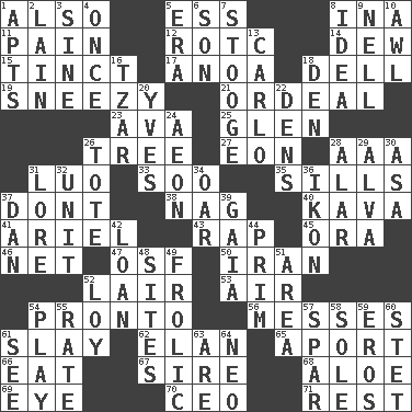 ACROSS 1. In addition 5. Curvy letter 8. _ tizzy (2 wds.) 11. Ache 12. College mil. group 14. Morning condensation 15. Tinged 17. Small Philippine buffalo 18. Small valley 19. Dwarf with a sinus problem 21. Severe or trying experience 23. Actress Gardner 25. Small, secluded valley 26. Woody plant 27. A really long time 28. American Automobile Association (abbr.) 31. Nilotic language 33. "Barney Miller" actor Jack 35. Beverly of Met fame 37. Do not 38. Tired old horse 40. Polynesian shrub of the pepper family 41. Satellite of Uranus 43. Reproach for some lapse or misdeed 45. Mouth or opening 46. Fish or hair follower 47. Order of Saint Francis (abbr.) 50. SW Asia republic 52. Den 53. Atmosphere 54. Right away 56. Makes clutter 61. Kill 62. Style 65. To the left, to Queeg 66. Consume 67. Title for a man of rank and authority 68. _ vera 69. Sight organ 70. Corporate head (abbr.) 71. Relief DOWN 1. Tenement units (abbr.) 2. (Had) reclined 3. Trig term 4. Single time 5. Epoch 6. Male offspring 7. Moe Howard, for one 8. The content of cognition 9. 1994 drama film starring Jodie Foster 10. Leather borer 13. Monte _, Las Vegas Hotel/Casino 16. Czar 18. Lair 20. Jacques Cousteau's middle name 22. Cub Scout units 24. Period of immesurable duration 26. Lug 28. Having or resembling wings 29. Inventor's middle name 30. White ___ sheet 31. Old wives' tales, e.g. 32. A single undivided whole 34. Boat paddle 36. Picture 37. Daniel's nick name 39. Greek goddess of the earth (variant) 42. Grant temporary use of 44. Demure 48. Locates 49. Play 51. Length times width 52. Myrna of the movies 54. Frolic 55. Pace 57. Practice fight 58. Not divided or shared with others 59. Greek god of love 60. Proofreading order 61. Perceive with the eye 63. "We ___ not amused" (Victoria) 64. Modern: prefix