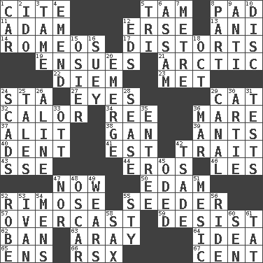 ACROSS 1. Quote 5. Scottish cap 8. Writing tablet 11. First of billions? 12. Celtic language 13. Cuckoo 14. Lover boys 17. What propaganda does 19. Takes place subsequently 21. Northern region 22. South Vietnam president (1954) 23. Was introduced to 24. R.R. building 27. Snake ____ (dice throw) 29. Domesticated feline 32. Bodily heat indicating an inflammation 34. To separate or throw off 36. Female horse 37. Came down and settled, as after flight 38. Separate the seeds from cotton 39. Pismires 40. Incision 41. Eastern Standard Time (abbr.) 42. Distinguishing feature 43. Compass dir. 44. Greek god of love 46. French article 47. Immediately 50. Dutch treat 52. Full of chinks, cracks, or crevices 55. Sowing specialist 57. Cloudy 59. Cease 62. Prohibit 63. Like ___ of sunshine 64. The content of cognition 65. Followers of ems 66. Acura sports coupe 67. Penny DOWN 1. 4-wheeled motor vehicle 2. Wedding promise 3. Docile 4. Make improvements or corrections to 5. Three (prefix) 6. Indian state 7. Distance measurement (Brit.) 8. Piece 9. Against 10. Flat circle 12. Begley and Asner 15. Flexible twig of a willow tree 16. Chop _ 18. Sep. follower 20. Develop 24. Heaps 25. Falsehoods 26. Place in a line 28. Gospel singer Marvin 29. Lessep's creation 30. Nick name for Arthur 31. Trials 33. Baseball player Mel 35. Main course 36. Spoil 42. Sadhe (variant) 45. Wrote a lyric poem 47. Not either 48. Witty Wilde 49. Erodes 51. Mesonic 52. Loose flowing garment 53. "Terrible" tsar 54. Not women's 55. Filthy place 56. Travel on or in a vehicle 58. Saxophone 60. Elected rep. 61. Make lace