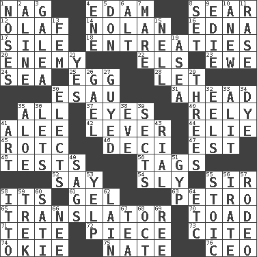 ACROSS 1. Tired old horse 4. Dutch treat 8. Wither 12. Norwegian king 14. Pitcher Ryan 16. Pulitzer Prize-winning author Ferber 17. Filth; sediment 18. Pleas 20. Foe 22. Raised railways 23. She-sheep 24. Ocean 25. Oval reproductive body of a fowl 28. Allow 30. Son of Isaac 31. Toward the future 35. 100% 37. Sight organs 40. Have confidence or faith in 41. Toward shelter 42. Crowbar 44. Writer Wiesel 45. College mil. group 46. Tenth: prefix 47. Eastern Standard Time (abbr.) 48. Trials 50. Labels 52. Declare 54. Cunning 55. Title for a knight 58. ___ a Wonderful Life 61. Set 63. Stone: prefix 65. Interpreter 70. Frog relative 71. Wig 72. Component 73. Quote 74. Migrant worker of the '30s 75. Nathan's nickname 76. Corporate head (abbr.) DOWN 1. Olfactory organs 2. Place in a line 3. An organ shaped like a helmet 4. Compass dir. 5. Spanish title 6. Keyboard modifier key 7. Female horse 8. Arrange properly for use 9. Singer Brickell 10. Afresh 11. Raze (variant) 13. Opposite of masc. 15. 1994 drama film starring Jodie Foster 19. At sea 21. Affirmative reply 26. Highlander 27. Ridiculed 29. Trios 30. Opts 32. Snakelike fish 33. Set down 34. Color 35. _ vera 36. Allows 38. First lady 39. Religious groups 41. Nonscientific branch of learning 43. Monetary unit of Yemen 49. Droops 51. Flimflam 53. Sharp bark 55. Unemotional 56. Feeling or showing extreme anger 57. Cowboy competition 58. "Tell ____ the Marines!" 59. Long journey 60. Suttee (variant) 62. (Had) reclined 64. And so on (abbr.) 66. Born 67. Afternoon social gathering 68. Sep. follower 69. To riddle