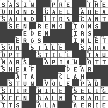 ACROSS 1. Indian antelope 6. Before (prefix) 9. Definite Article 12. U. of Maine site 13. Highlander 14. Type of rug 15. Vegetable dish 16. Hats (slang) 17. Patter 18. Elected rep. 19. Former U.S. Attorney General Janet 20. Charged particles 21. Paradise 23. Big collection agency 24. Greek god of love 25. An arm off of a larger body of water 28. Boy, to dad 30. Vertical member of a panel or frame 34. "Two Mules for Sister ____" 35. Elect 36. Not moving 38. The 19th letter of the Greek alphabet 39. Armed conflicts 41. Bee-related 43. Baseball player Mel 44. Archer's quiver 46. Letter starter 48. "One Day ___ Time" 49. Burrowing marine mollusk 50. Make senseless or dizzy 51. Short-tailed, large-bodied rat 53. Groovy apt. 56. Tumult 57. The longest river in the world 58. Major League Baseball Commissioner Bud 60. Peachy ____! 61. Lip ointment 62. Exchange 63. It is 64. Wing 65. Nest on high DOWN 1. Distress signal 2. Ancient river in northeast Turkey 3. Flatfish 4. More lacking in sense or substance 5. Lower and raise head in agreement 6. Ache 7. Do over again 8. Raised railways 9. Interpreter 10. Coop moms 11. Consume 13. Small, secluded valley 14. Oak nuts 19. Musical pauses 20. One more than two 22. Two (Sp.) 24. Pleas 26. Part of Q.E.F. 27. Tense 28. Sty mamas 29. Brightly colored fish 31. Call ___ day 32. Mouth edge 33. Connecticut Ivy Leaguer 37. Dipping utensil 40. Titan orbits this 42. Teachers' org. 45. Air blower 47. Electrical Unit 49. To starve (Brit.) 50. Proofreading order 51. Small bottle 52. Water jar 54. Having or resembling wings 55. "You Light Up My Life" star Conn 56. What Jean-Claude Killy likes to do 57. Basketball assoc. 58. R.R. building 59. Turn to the right