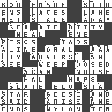 ACROSS 1. Surprise greeting 4. Take place subsequently 9. Commotion 13. Followers of ems 14. Shoestrings 15. Unable to walk 16. Fish or hair follower 17. Lacking originality or spontaneity 18. Like ___ of sunshine 19. Ocean 21. Had dinner 22. Simple song 24. Be tempered by heat 26. Compass dir. 27. Mexican monetary units 29. Bits 30. Place in a line 31. Relating to the mouth 33. American Automobile Association (abbr.) 36. 54 in ancient Rome 37. Contrary to your interests or welfare 40. Indian title of respect (Mr.) 41. Observe 42. Shed a tear 43. Administered medicine 45. Glance over 47. Annoying sound 48. Actor Linden 49. Atlas contents 50. Schedule 52. Environmental prefix 54. R.R. building 56. Play the lead 57. Honkers 59. Added to 61. Alleged 62. Originate 63. Compass dir. 64. Extremities 65. High-strength synthetic material 66. Nine, plus one DOWN 1. Benjamin's nick name 2. Singles 3. Clearly or manifestly demonstrative 4. Raised railways 5. Relating to or accompanying birth 6. Leave at once 7. Ubangi River tributary 8. Compass dir. 9. Chalkboards 10. Small pie 11. "If ____ say so..." 12. Marina Del _, California 20. A really long time 22. Allots cards 23. Indiana (abbr.) 25. Toward the sea 27. Friends 28. Writer Wiesel 29. Canvas cover 31. Baking chamber 32. To sift 33. Helper 34. Ancient Greek god of war 35. Assistant 38. A sleeping potion; an opiate (poet.) 39. Pulitzer Prize-winning author Ferber 44. I made a mistake 45. Pottery fragments 46. Feline 49. With motion or animation 50. Comedian Laurel of Laurel & Hardy 51. Put down 52. Suggestive of the supernatural 53. To provide with a ceiling 55. Queen of England 1702-14 56. Compass dir. 57. Separate the seeds from cotton 58. Car or cant ending 60. Lair