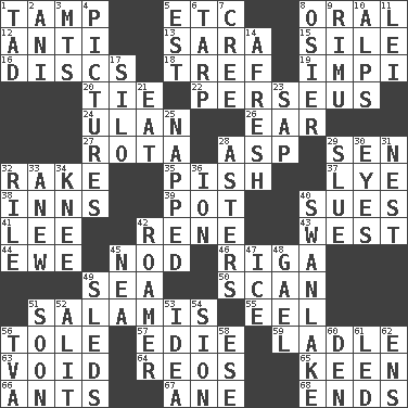 ACROSS 1. Pack (down) 5. And so on (abbr.) 8. Spoken 12. Against 13. "Two Mules for Sister ____" 15. Drop; flow; fall 16. Plates 18. Unclean, religiously 19. Body of Kaffir warriors 20. Standoff 22. Son of Zeus who helped slay Medusa 24. Uhlan (variant) 26. Hearing organ 27. Round or rotation of duties 28. Cleo's killer 29. Elected rep. 32. Immoral or dissolute person 35. Expression of disdain 37. Sodium hydroxide 38. Restaurants 39. Cooking vessel 40. Institutes legal proceedings 41. Area sheltered from the wind 42. French philosopher Descartes 43. Compass direction 44. She-sheep 45. Dreamland 46. Capital of Latvia 49. Ocean 50. Glance over 51. Deli grouping 55. Snakelike fish 56. Lacquered or enameled metalware 57. Singer Brickell 59. Dipping utensil 63. State of nonexistence 64. Vintage cars 65. Peachy ____! 66. Pismires 67. One (Scot) 68. Extremities DOWN 1. Small boy 2. Cuckoo 3. Mountains (abbr.) 4. Photos 5. Eastern Standard Time (abbr.) 6. Canvas cover 7. Algonquian 8. Flexible twig of a willow tree 9. Tall New Zealand timber tree 10. High mountains 11. Luau accessory 14. Anew 17. Grain storage tower 21. Consume 23. Plant excrement 25. Slept 28. Michaelmas daisies 29. Turn sharply 30. Snake ____ (dice throw) 31. Egg locale 32. Cause heat under the collar 33. Afresh 34. Leg joint 36. Electrically charged atom 40. Tchaikovsky ballet 42. Wanderer 45. Teachers' org. 47. Frozen water 48. Highlander 49. Bobsleighs 51. Within a short period 52. Set down 53. The main thing one is thinking about 54. The Jewish people; Israel 56. Federal power corp. 58. Compass dir. 60. Lair 61. Directed 62. Followers of ems