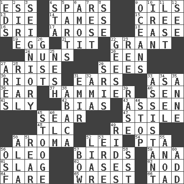 ACROSS 1. Curvy letter 4. Practice fights 9. Lubricates 13. Expire 14. Domesticates 15. Algonquian 16. _ Lanka 17. Came up 18. Relaxation 19. Oval reproductive body of a fowl 21. Teat (slang) 22. Monetary aid 24. Religious women 26. Car or cant ending 27. Originate 29. Observes 30. Disturbances 31. Hearing organs 33. White ___ sheet 36. Ewer handle 37. More overdramatic by comparison 40. Elected rep. 41. Mischievous 42. Prejudice 43. NE Netherlands city 45. Wither 47. Vertical member of a panel or frame 48. Affectionate concern, for short 49. Vintage cars 50. Scent 52. Luau accessory 54. Parent Teacher Association (abbr.) 56. Butter sub 57. Avian creatures 59. Santa ___, CA 61. Volcanic refuse 62. Fertile tracts in a desert 63. Dreamland 64. Conductor's collection 65. Take or capture by force 66. Small boy DOWN 1. Begley and Asner 2. Father 3. Signiory (variant) 4. R.R. building 5. Pieces 6. Mine, in Marseilles 7. Relief 8. Compass dir. 9. Seas 10. SW Asia republic 11. For fear that 12. Perceive with the eye 20. Abrupt rush of wind 22. Honkers 23. To sift 25. Soft 27. Ancient Greek god of war 28. Monetary unit of Yemen 29. Indian titles of respect 31. Arab leader 32. Wet nurse (var.) 33. Aide 34. Stitch closed the eyes of (a falcon) 35. Singer Murray 38. Phillipine bananalike plant 39. To erase 44. Constrict 45. Moe Howard, for one 46. Shade tree 49. Amusement-park features 50. Silent film actress Nazimova 51. Stern 52. One who doesn't tell the truth 53. Celtic language 55. Small Philippine buffalo 56. Order of Saint Francis (abbr.) 57. Arrow shooter 58. Fast jet (abbr.) 60. Increase