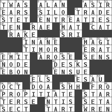 ACROSS 1. It was, poetically 5. ____ Jay Lerner 9. SW Saudi Arabia district 13. Hearing organs 14. Grain storage tower 15. Swap 16. Proofreading order 17. Pleas 19. "___ Little Indians" 20. Actress Charlotte 21. Floor protector 22. Feline 23. Immoral or dissolute person 25. _ Lanka 26. Silly 30. Wise men 34. Southeast Indonesia island 35. Part of Q.E.F. 36. Send forth 39. Came up 42. Elected reps. 43. Thickened enlargement 44. Writing tables 46. Inky black, to poets 47. Follow as a consequence or result 48. Raised railways 51. Son of Isaac 54. Sep. follower 57. ___ good deed 58. Quiet! 60. From 62. Appease 65. Play the lead 66. Laconic 67. Nuclear Threat Initiatives 68. Stalk of a moss capsule 69. Religious group 70. Small pie 71. Songbird DOWN 1. Trial 2. Wetness 3. Sports stadium 4. Fast jet (abbr.) 5. At sea 6. Actor's bit 7. The first octave above the treble staff 8. Typical standards 9. Nonscientific branch of learning 10. Ketch in the Levant 11. It may be bright or harebrained 12. Respite 15. Jacques of French films 18. Hearing organ 20. Painter Guido (1575-1642) 24. Baby cat 27. Housemaid (var.) 28. And not 29. Eat (away) 30. Makes clutter 31. "We ___ not amused" (Victoria) 32. Separate the seeds from cotton 33. ___ a Wonderful Life 36. Compass dir. 37. Crowd into 38. Wedding promise 40. Elected rep. 41. Double-curved letter 45. Malaysian steamed pastry 48. Singer Brickell 49. Car dealer's back yard 50. Virtuous person 52. Following 53. A salt of uric acid 54. Elects 55. Algonquian 56. Torque (variant) 58. Commotion 59. Behest 61. Northwest Algerian city 63. Pacific Standard Time (abbr.) 64. "One Day ___ Time" 65. Compass dir.