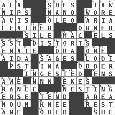 ACROSS 1. According to 4. "______ My Girl" (Turtles hit) 8. The 23rd letter of the Hebrew alphabet 11. Pinches, bites 13. Billionth: prefix 14. Had on 15. Opinion 16. Margarine 17. Operatic vocal solo 18. Cordwainer's material 21. Channel Islands abalone 22. Filth; sediment 23. Apple computer (short form) 25. Raised railways 26. Fast jet (abbr.) 29. What propaganda does 32. Related on the mother's side 34. Mouth or opening 35. Single 38. Opera by Verdi 39. Gurus 41. Farming town in central California 43. Pacific Standard Time (abbr.) 44. _ tizzy (2 wds.) 45. More peculiar 46. Eaten 50. Followers of ems 51. Deep reverence 54. Compass dir. 55. Supplements with great effort 57. Indian princess (variant) 59. Nestling 63. Celtic language 64. Look after 67. Length times width 68. Part of speech 69. Leg joint 70. Repose 71. One (Scot) 72. Wrote a lyric poem 73. A female animal or person DOWN 1. Of or related to the anus 2. Moving, as bait 3. Capital of Western Samoa 4. Sounds asleep 5. Actor Linden 6. Compass dir. 7. "Barney Miller" actor Jack 8. Singer Mel 9. Satellite of Uranus 10. Puts on (as clothing) 12. Fast planes 14. Armed conflict 19. Flintstone garb 20. Connecticut Ivy Leaguer 21. Sep. follower 23. Greater amount 24. Ancient river in northeast Turkey 26. Ocean 27. Clip 28. Small amounts or degrees 30. Ancient Roman robes 31. Exchanged or delivered for money 33. Jacques of French films 36. Connecting point 37. Genesis locale 39. Public display of a written message 40. Afresh 42. Big collection agency 45. Lyric poems 47. Compass dir. 48. Watched over 49. Make supply last 51. Sports stadium 52. Make _____ (do battle with) 53. Take place subsequently 56. Play the lead 58. Car or cant ending 60. Angers 61. Soft 62. Yard entry 64. Ring climax 65. Conclude 66. Born