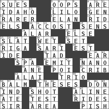 ACROSS 1. Takes to court 5. I made a mistake 9. "We ___ not amused" (Victoria) 12. Potato state 14. _ and Stitch 15. Commissioned military rank (abbr.) 16. Less widely known 17. Flair 18. To free from 19. Raised railways 20. Buttonhole 23. Elected reps. 24. Having or resembling wings 25. Otherwise 27. Narrow board 30. Dripping 32. Arrange properly for use 33. Capital of Latvia 34. Indian skirt 36. Eastern Standard Time (abbr.) 38. Binary compound 39. Small boy 40. Hearing organ 43. Health resort 46. Send forth 48. Billionth: prefix 49. One (Scot) 51. Luau course 52. Baby bed with high sides 53. Mountain range southwest of Kyrgyzstan 54. Musical group of three 56. Lip ointment 58. College papers 61. Spanish title 64. Working for oneself (abbr.) 65. Attempt 66. Place in a line 68. Had dinner 69. Trial 70. Amusement-park features 71. Title for a knight 72. Length times width 73. Expression of disdain DOWN 1. Title for a man of rank and authority 2. Allodial 3. Hearing organs 4. A female animal or person 5. Margarine 6. Lubricates 7. Food holders 8. Boy, to dad 9. Match 10. It's straight from the horse's mouth 11. Conclusions 13. Relating to the mouth 21. Crow sounds 22. Make 23. Fast planes 24. "One Day ___ Time" 26. Area sheltered from the wind 27. _ Lanka 28. Hat (slang) 29. Matures 31. _____ steamer (cargo ship) 35. Foolish or stupid persons 37. Lacerate 41. Black tropical American cuckoo 42. Director Reiner 44. Inside of hand 45. Santa ___, CA 47. Become fatigued 48. Non-commissioned officer (abbr.) 50. One or the other of two 53. Tree or shrub in the Birch family 55. Austrian river, tributary to the Danube 56. Prejudice 57. Against 59. Flexible conduit 60. Singer James 61. "You Light Up My Life" star Conn 62. Washington bills 63. Delicate 65. R.R. building 67. Mouth edge