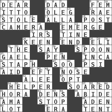 ACROSS 1. Letter starter 5. Male parent 8. Opposite of masc. 11. "Tell ____ the Marines!" 12. Cassini of fashion 14. Actress Charlotte 15. Fur scarf 17. Silent film actress Nazimova 18. Mail 19. Device for capturing images 21. Develop 23. Big collection agency 25. Prong on a fork 26. Peachy ____! 27. Conclude 28. Connecticut Ivy Leaguer 31. Definite Article 33. Declare 35. Soup utensil 37. Highlander 38. Animal enclosure 40. South American Indian 41. Staphylococcus 43. "Barney Miller" actor Jack 45. 23rd letter of the Greek alphabet 46. Assist 47. Bank Draft (abbr.) 50. Olfactory organ 52. Toward shelter 53. Choose 54. Aide 56. Flew 61. Israeli folk dance 62. Habitations of wild animals 65. Stay 66. Nanny (var.) 67. Obstruct or block passage 68. Arabian gulf 69. Car dealer's back yard 70. Period 71. Portable shelter DOWN 1. Plate 2. Singer James 3. Tiny particle 4. Hero or heavy, e.g. 5. ___ good deed 6. Everything 7. Erase 8. Tree-dwelling hopper 9. Relaxation 10. Was introduced to 13. Street urchin 16. 4th largest of the Great Lakes 18. Before (prefix) 20. Ancient Greek god of war 22. Extremities 24. Fastener 26. Seaweed 28. Immeasurably long periods of time 29. Event scenes 30. _ tizzy (2 wds.) 31. Jacques of French films 32. Froth on beer 34. Affirmative reply 36. Corncob 37. Girls' org. (abbr.) 39. Words to Nanette 42. Assist 44. I made a mistake 48. Eats 49. Cigar-shaped 51. Portico 52. Insect wing 54. Like (prefix) 55. Part of Q.E.F. 57. Blind as ____ 58. Travel on or in a vehicle 59. Genesis locale 60. Gouge 61. Actor Linden 63. And not 64. Health resort