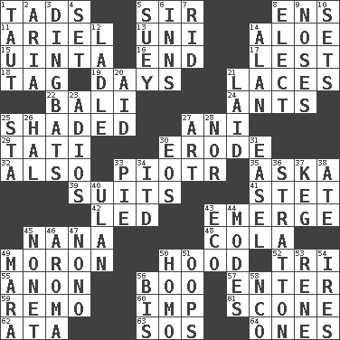 ACROSS 1. Small boys 5. Title for a knight 8. Followers of ems 11. Satellite of Uranus 13. Corn or form start 14. Medicinal plant 15. National forest in Provo, Utah 16. Conclude 17. For fear that 18. Label 19. 24-hour periods 21. Shoestrings 22. Indonesian resort city 24. Pismires 25. Cast a shadow over 27. Black tropical American cuckoo 29. Jacques of French films 30. Eat (away) 32. In addition 33. Peter (Polish) 35. "____ silly question..." 39. Sets or collections 41. Proofreading order 42. Directed 43. Develop 45. Grandmother 48. Root beer relative 49. Person of subnormal intelligence 50. Parka part 52. Three (prefix) 55. At once, immediately (arch.) 56. Sometimes accompanies a hiss 57. Keyboard key 59. San ____ (Riviera town) 60. Mischievous child 61. Biscuitlike quick bread 62. _ moment's notice (2 wds.) 63. Mayday 64. Singles DOWN 1. Pulled tight 2. Operatic vocal solo 3. Empty-headed or silly people 4. Put into a specified state 5. Chop _ 6. Lodging establishments 7. To free from 8. Opt 9. Olfactory organs 10. Puts into a specified state 12. Dipping utensil 14. ____ Jay Lerner 20. Help 21. Put down 23. Goodbye (Sp.) 25. R.R. building 26. Actor Linden 27. Tate display 28. And not 30. Greek goddess of the dawn 31. Artist's stand 33. Sliced dessert 34. It would 36. Ski resort town in Vermont 37. Cask 38. Had dinner 40. ____ Bator 43. Environmental prefix 44. Methods 45. Music written for nine 46. Scent 47. Words to Nanette 49. Hindu Mythology: god of death 50. Like (prefix) 51. I made a mistake 53. French philosopher Descartes 54. Angers 56. Twice 58. Non-commissioned officer (abbr.)