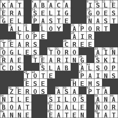 ACROSS 1. Krazy ___ of comics 4. Phillipine bananalike plant 9. Capri or Wright 13. Period 14. Major League Baseball Commissioner Bud 15. Leaves 16. Set 17. Thick mixture 18. Political cartoonist Thomas 19. Everything 21. Myrna of the movies 22. To the left, to Queeg 24. Drink excessively 26. Atmosphere 27. Lacerates 29. Algonquian 30. Stares at amorously 31. "Corrida" creature 33. The 18th letter of the Arabic alphabet 36. Actress Charlotte 37. Rending 40. What Jean-Claude Killy likes to do 41. Music discs 42. Thick slice 43. Columnist Joseph or Stewart 45. Carry 47. Aches 48. Compass dir. 49. Cloth borders 50. Nothings 52. White ___ sheet 54. Parent Teacher Assoc. 56. Mediterranean tributary 57. Grain storage towers 59. Santa ___, CA 61. Water vessel 62. Peak District village in England 63. Or not 64. Singer Murray 65. Eroded 66. Make lace DOWN 1. Cask 2. Length times width 3. Baron Munchausen's specialties 4. Cleo's killer 5. Memphis, Tenn. Street 6. In addition 7. Municipality 8. Mature 9. Dismiss 10. Fly high 11. For fear that 12. Eastern Standard Time (abbr.) 20. Old wives' tales, e.g. 22. Composer Copland 23. Sliced dessert 25. Inconspicuous attention getter 27. Torque (variant) 28. Mild oath 29. Baby bed with high sides 31. Story 32. Mouth or opening 33. Aide 34. Picture 35. Cuts off 38. _____ Park, CO 39. Yawn 44. Desk light 45. Cigar-shaped 46. Bear (Spanish) 49. White Person, in Hawaii 50. The Jewish people; Israel 51. Liveliness 52. Opera by Verdi 53. Narrow board 55. Small Philippine buffalo 56. Basketball assoc. 57. Perceive with the eye 58. Elected rep. 60. Nonscientific branch of learning